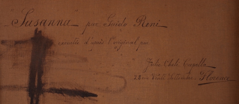 A magyar fordítás szerint Capella az eredeti Guido Reni-festményről készítette a másolatot: - "Zsuzsanna" - Guido Renitől. Az eredeti után kiviteleztetett Julie Cheli Capella által, Firenze, Szeptember huszadika út 28. A szöveget a firenzei Uffizi Képtár (Galleria degli Uffizi) vörös viaszpecsétjével hitelesítették, mely töredékesen is jól azonosítható a vászon szegélyén.
