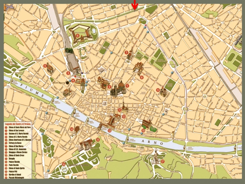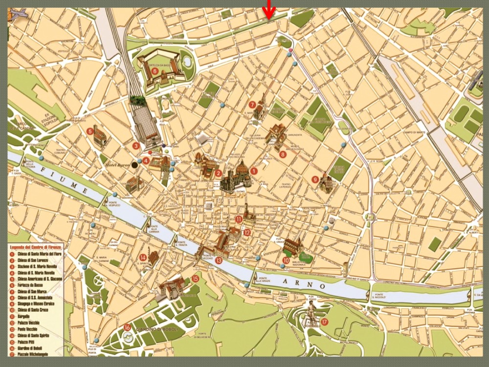 12. kép: Firenzei turista térkép. Az Uffizi Képtár a 13. pontnál látható az Arno mellett. Julie Cheli Capella rezidenciájának egykori helyét a piros nyíl jelzi.