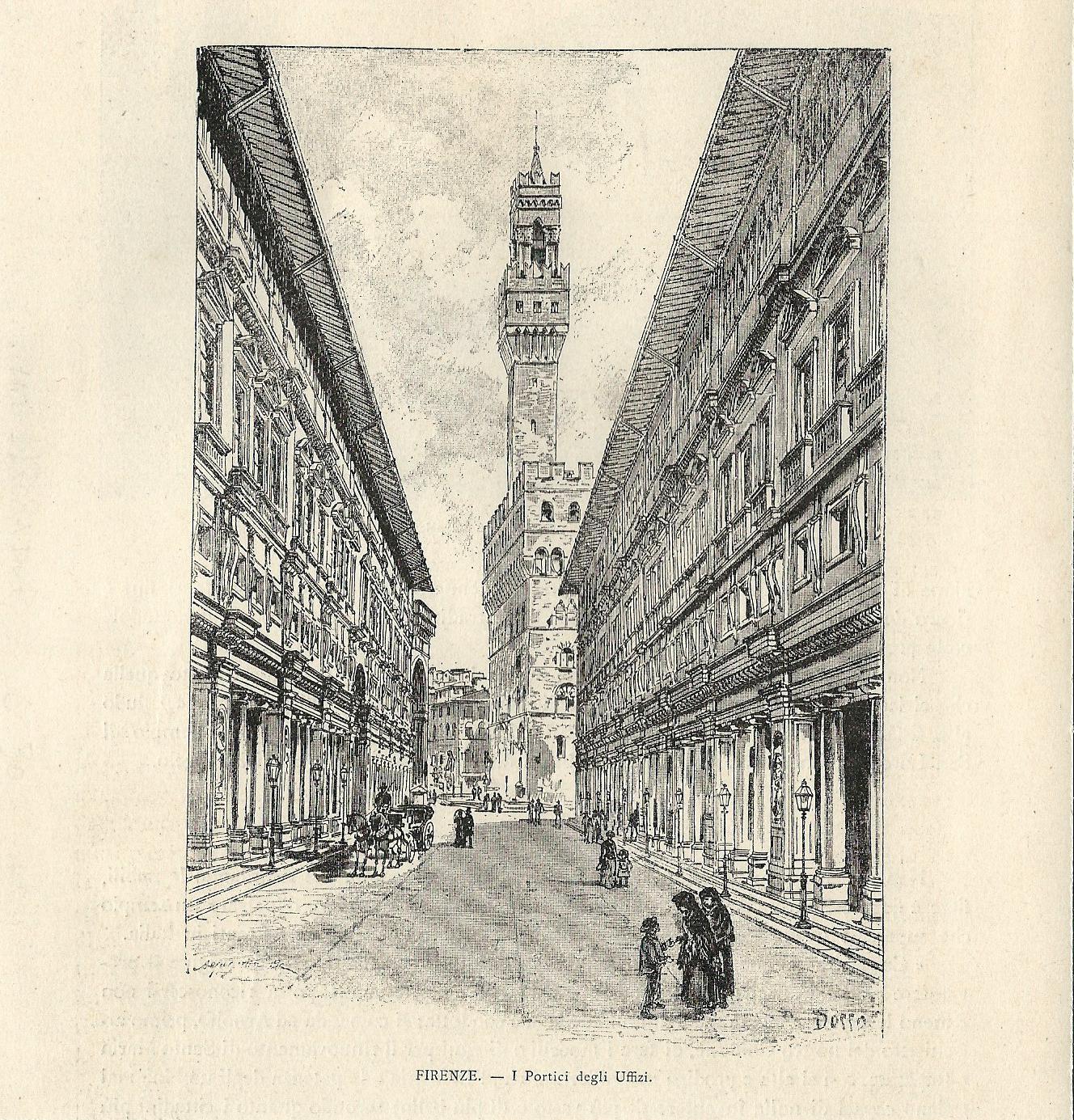 10. kép: 1892-ben kiadott nyomat: A firenzei Uffizi bejárata, hátterében a Palazzo Vecchioval. fametszet, a bélyegkép mérete: 155x110 mm, tervező: Dosso, rézmetsző: A.Quantin