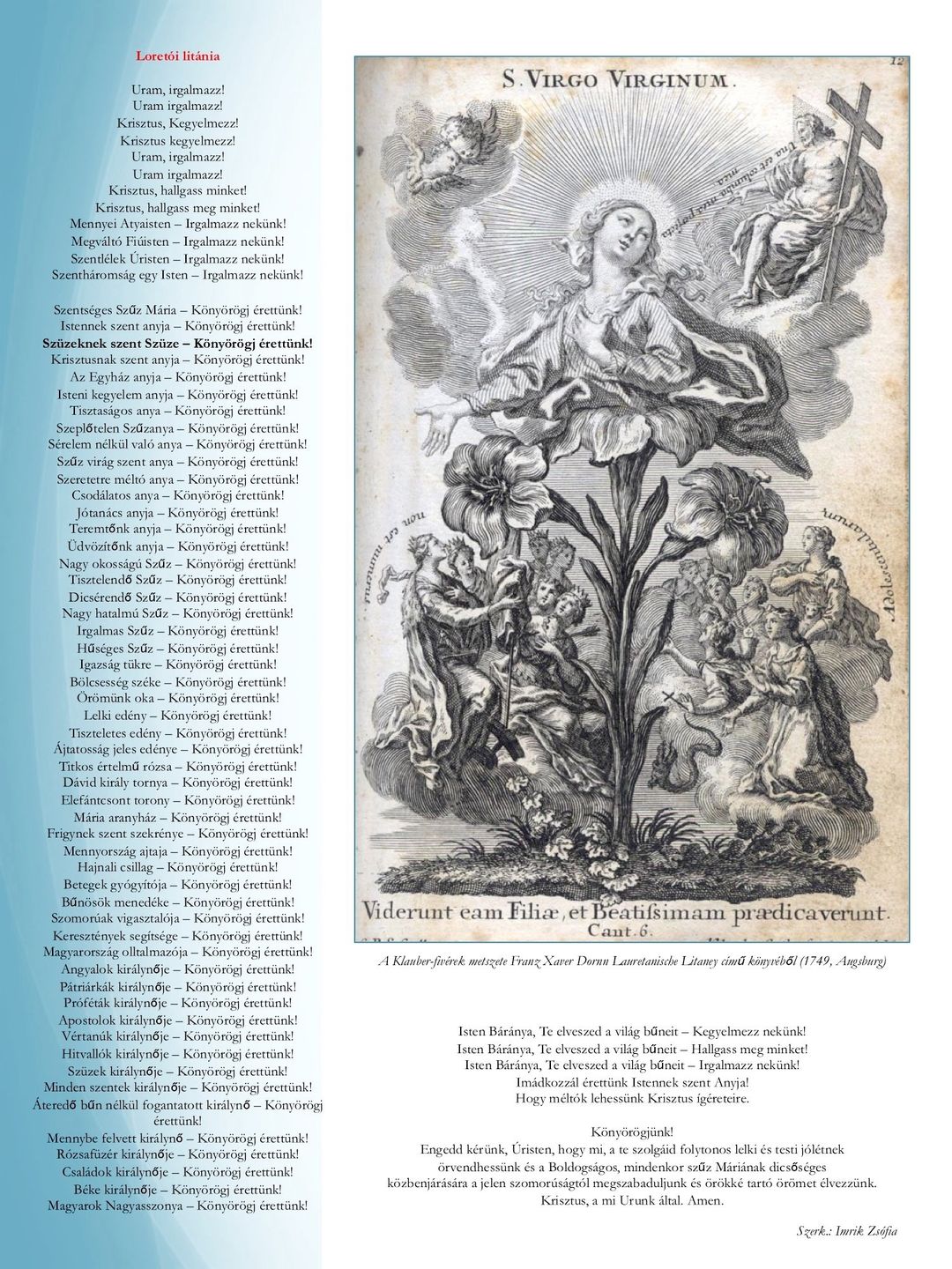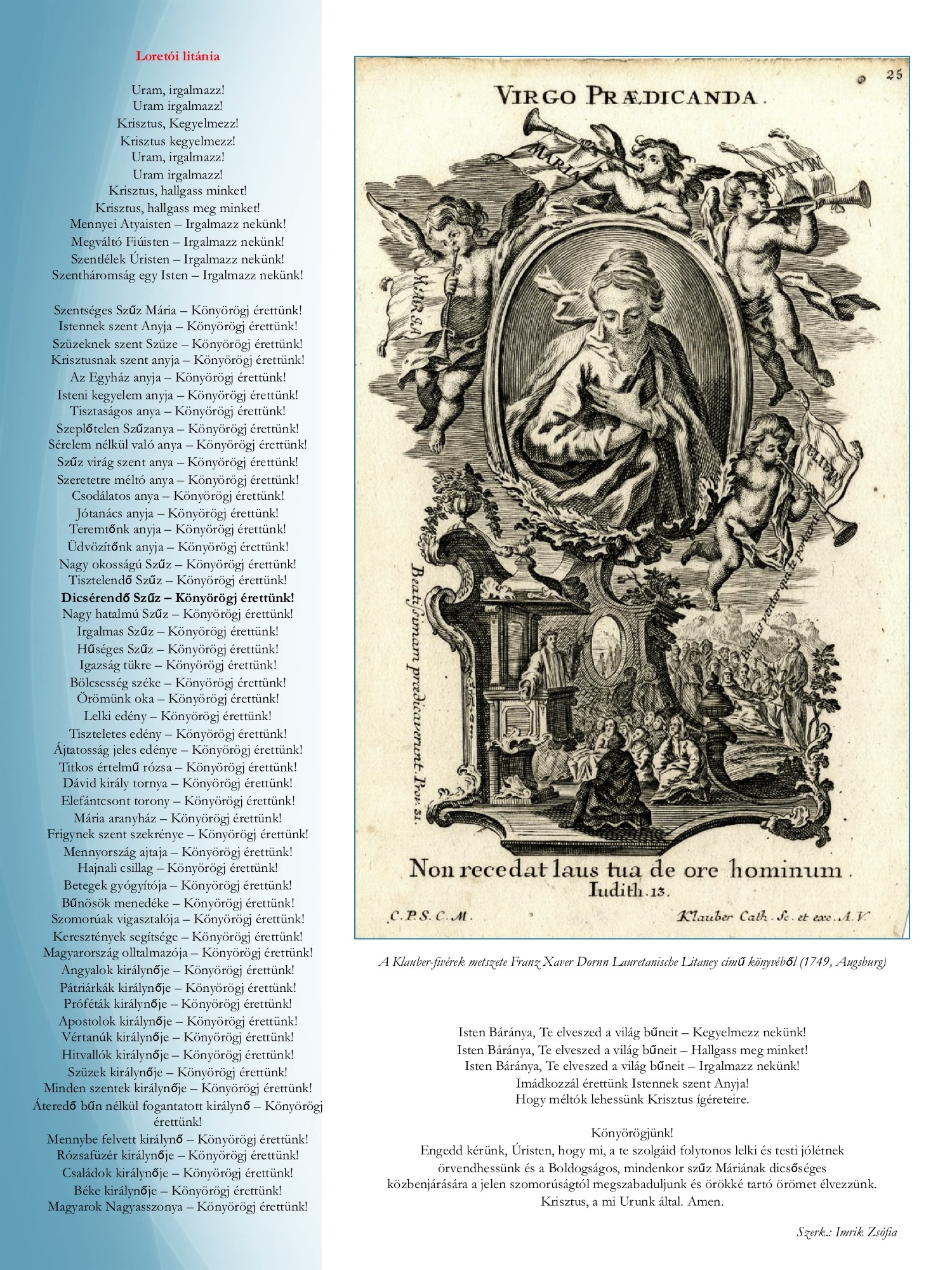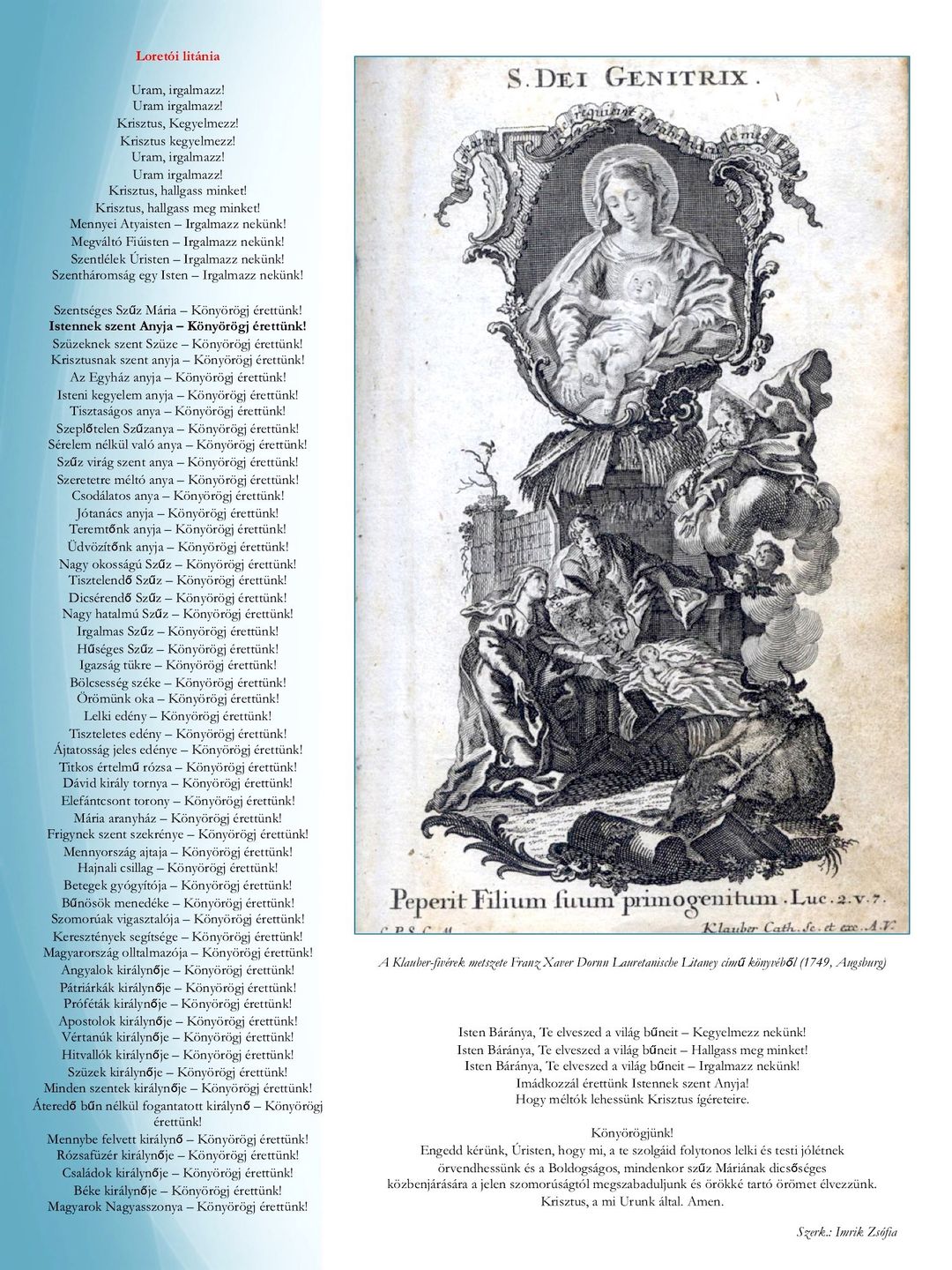 A Szűzanyát 52-féleképpen megszólító könyörgést alapformájában 48 megnevezéssel 1500 körül már nyilvánosan imádkozták Loretóban. A 48 invokációból 13 Isten szűz Anyját, 5 az erények hordozóját, 13 az ószövetségi előképekben jövendölt Máriát, 5 az oltalmazót, 12 pedig a királynőt kéri: „könyörögj érettünk!” Nyomtatásban 1558-ban Kaniziusz Szent Péter kiadásában jelent meg, egyetemes használatát 1691-ben VII. Orbán pápa rendelte el dekrétumában. A Klauber-fivérek metszet-illusztrációi Franz Xaver Dornn Lauretanische Litaney című könyvében jelentek meg 1749-ben Augsburgban.