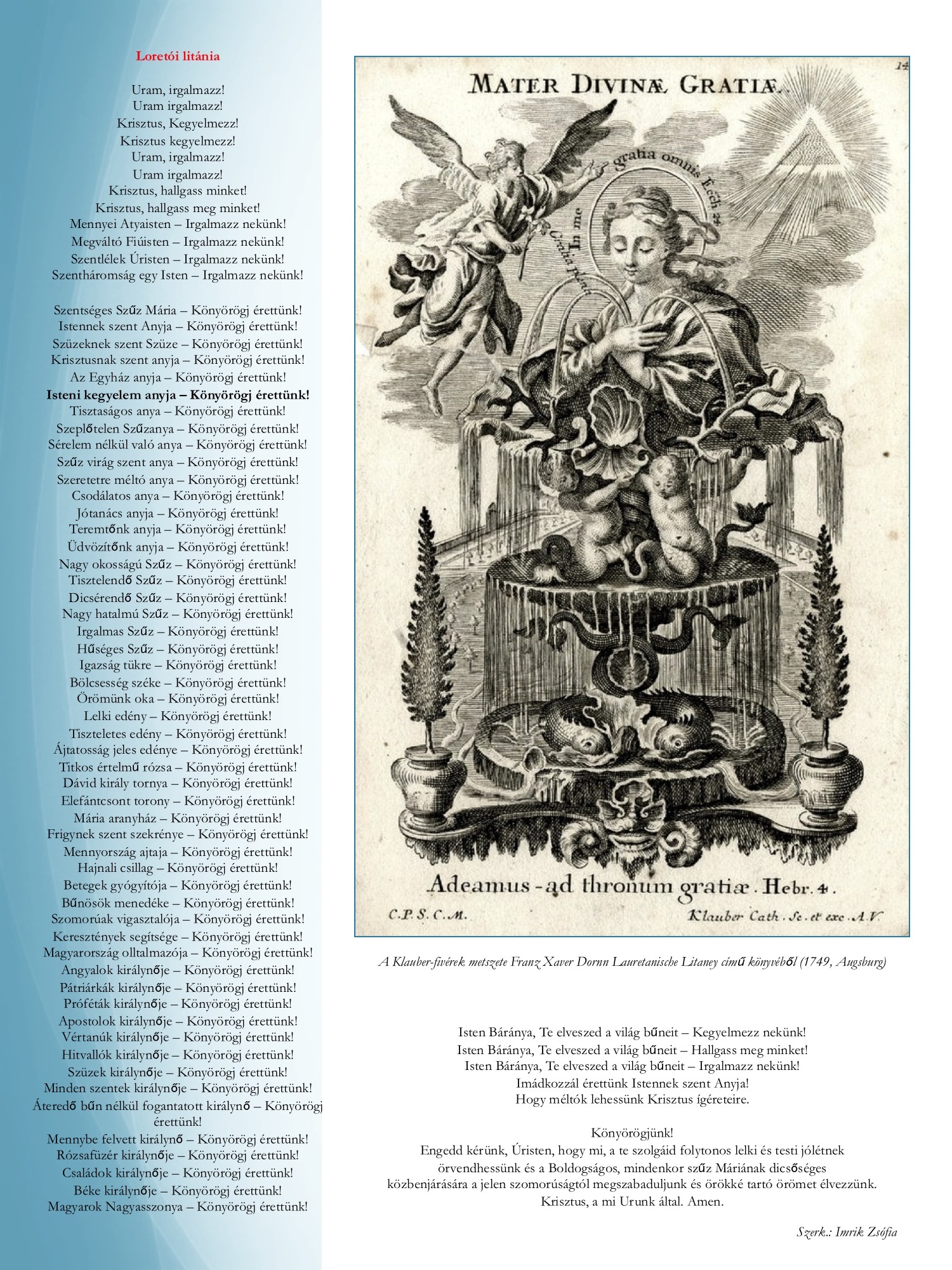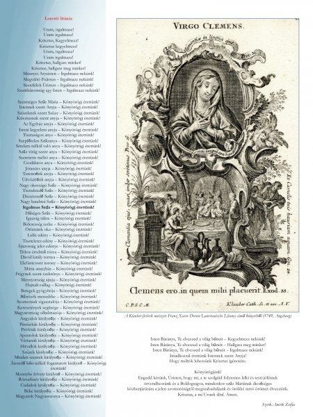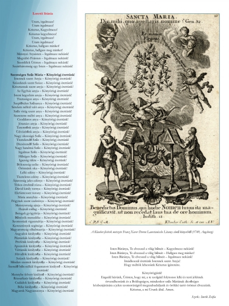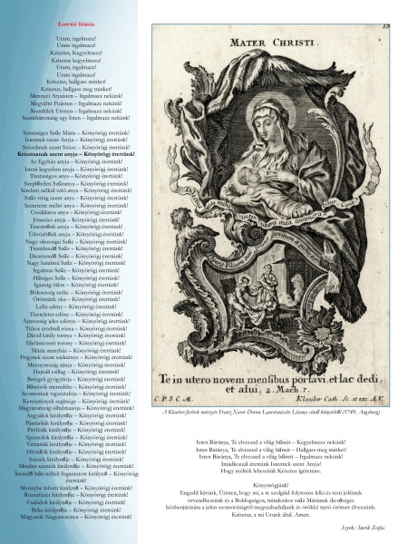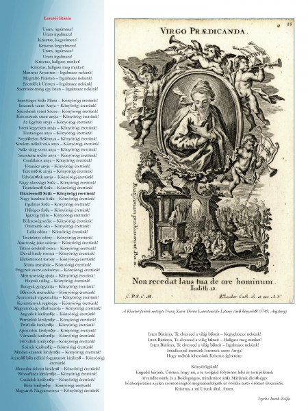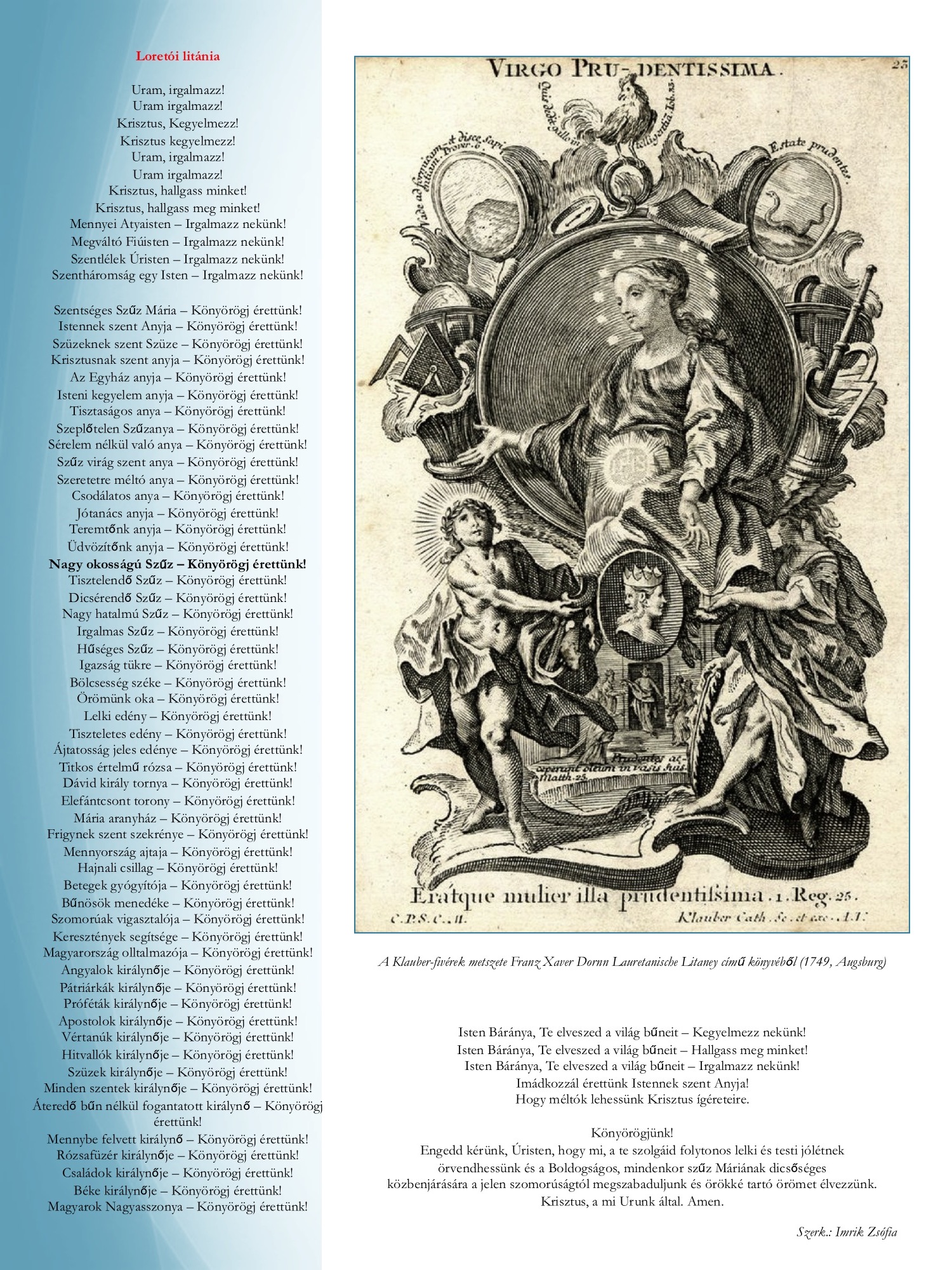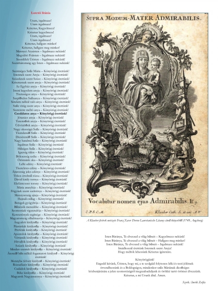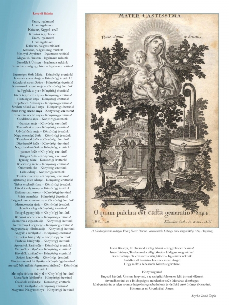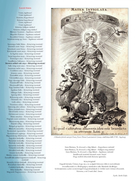 "Pulchra ut luna" (Ragyog, mint a hold) – olvasható az Énekek énekének idézete a Klauber-fivérek metszetének tetején: “Ki az, aki úgy ragyog, mint a hajnal pírja, s szép, mint a telihold …?” (Én 6,10) (SZIT) A sötét égbolton a Szűzanya tűnik fel áldást osztó gyermekével a telihold világító korongján.