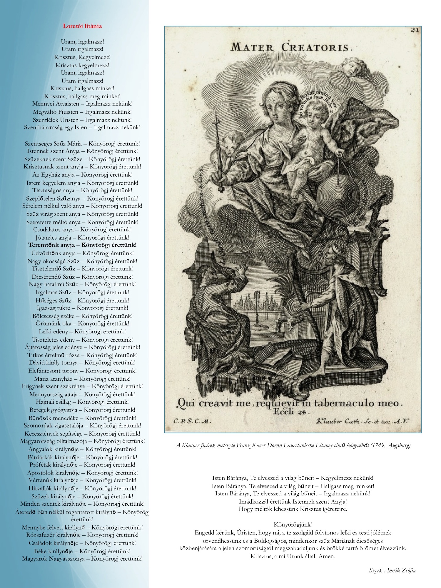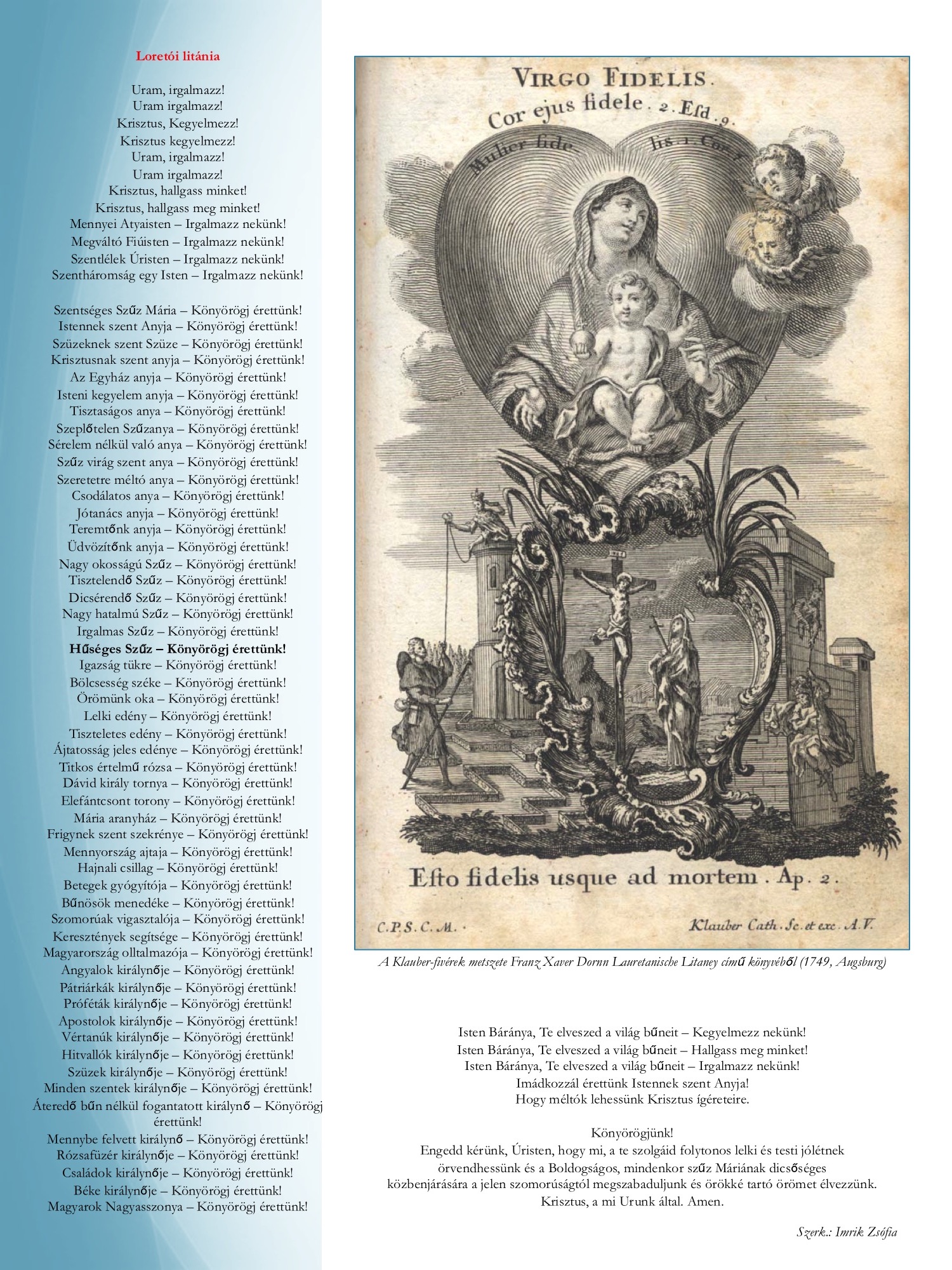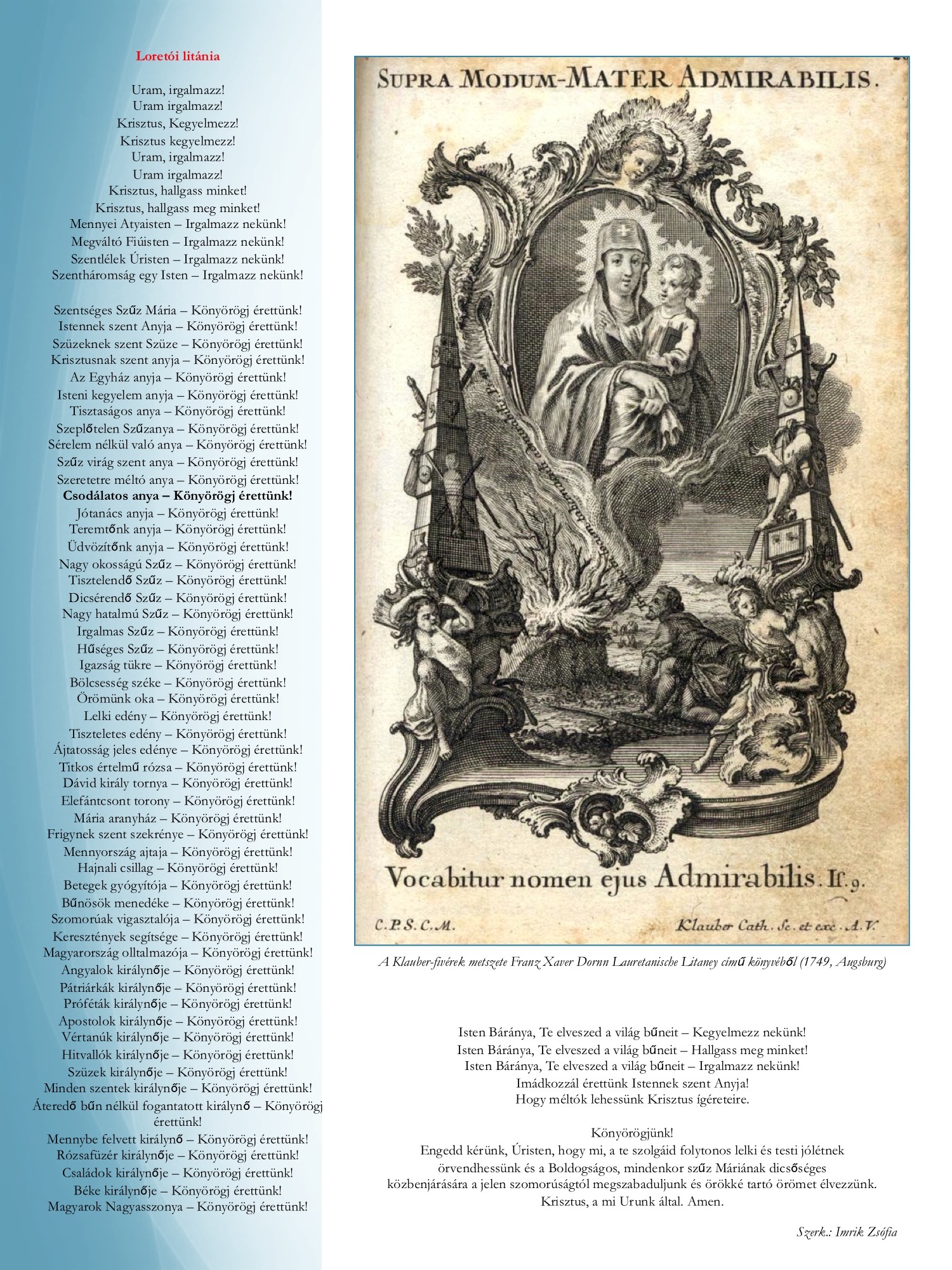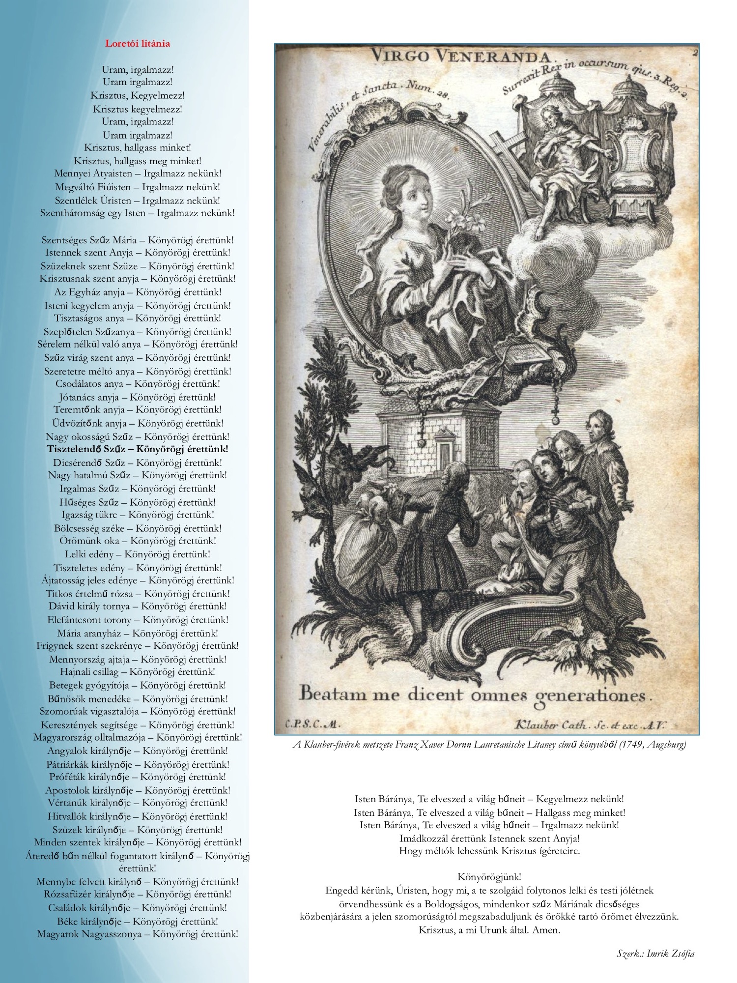 "Pulchra ut luna" (Ragyog, mint a hold) – olvasható az Énekek énekének idézete a Klauber-fivérek metszetének tetején: “Ki az, aki úgy ragyog, mint a hajnal pírja, s szép, mint a telihold …?” (Én 6,10) (SZIT) A sötét égbolton a Szűzanya tűnik fel áldást osztó gyermekével a telihold világító korongján.