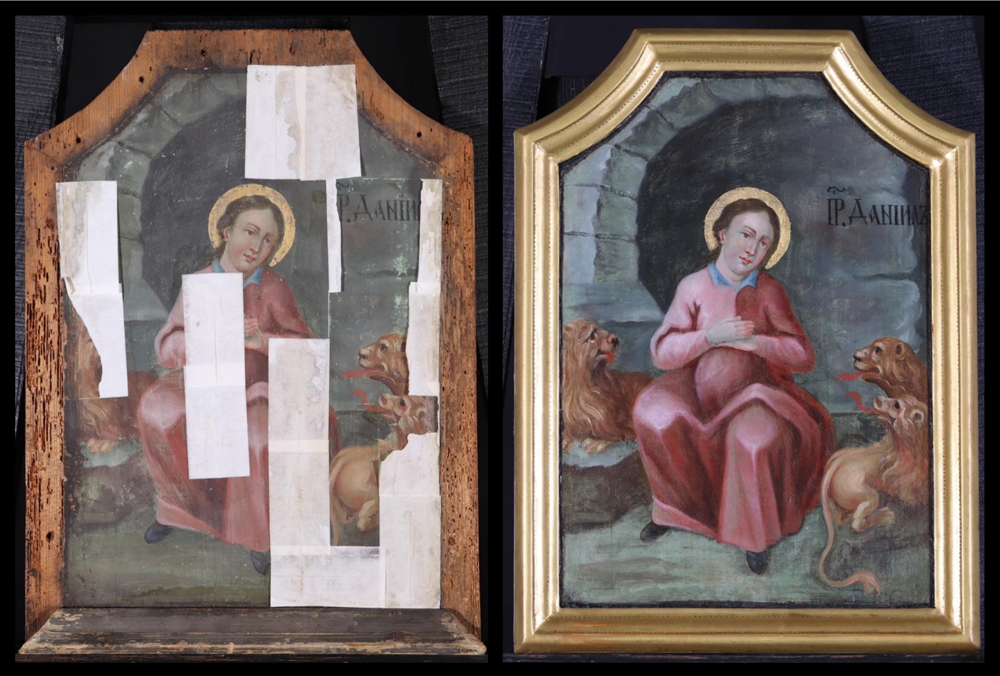 Dániel, a négy nagy ószövetségi próféta egyike, sötét veremben ül Bábelben, három oroszlán társaságában. Az állatok engedelmesen figyelik az ifjút, ahogy kezeit mellén összefonva imádkozik. Így magasztalta Istent azelőtt is, hogy idehozták, s ezzel megszegte a harminc napig érvényben lévő királyi parancsot, melyet irigyei eszközöltek ki, amiért a méd Dárius a Júda foglyai közül való Dánielt akarta egész birodalma fölé rendelni annak kiválósága miatt. Dániel így szólt börtönéből az aggódó királyhoz: „Király, örökké élj! Az én Istenem elküldte angyalát és bezárta az oroszlánok száját, és ezek nem ártottak nekem, mert ő igaznak talált engem; de ellened sem követtem el bűnt, király!” (Dán 6,22-23) Miután Dánielt sértetlenül húzták ki a veremből, vádlóit küldték helyébe, kiknek csontjait azonnal összetörték az oroszlánok. Dáriusz király így írt minden népnek, törzsnek és nyelvnek: “Elrendeltem, hogy egész birodalmamban és országomban rettegjék és féljék Dániel Istenét, Mert ő az élő Isten, és örökké az marad; az Ő országának nem lesz vége, és hatalma örökké tart. Ő megment és megszabadít, jeleket és csodákat művel az égen és a földön; Ő, aki megszabadította Dánielt az oroszlánok verméből.” (Dán 6,27-28) Dániel szabadulása Krisztus feltámadásának ószövetségi előképe.