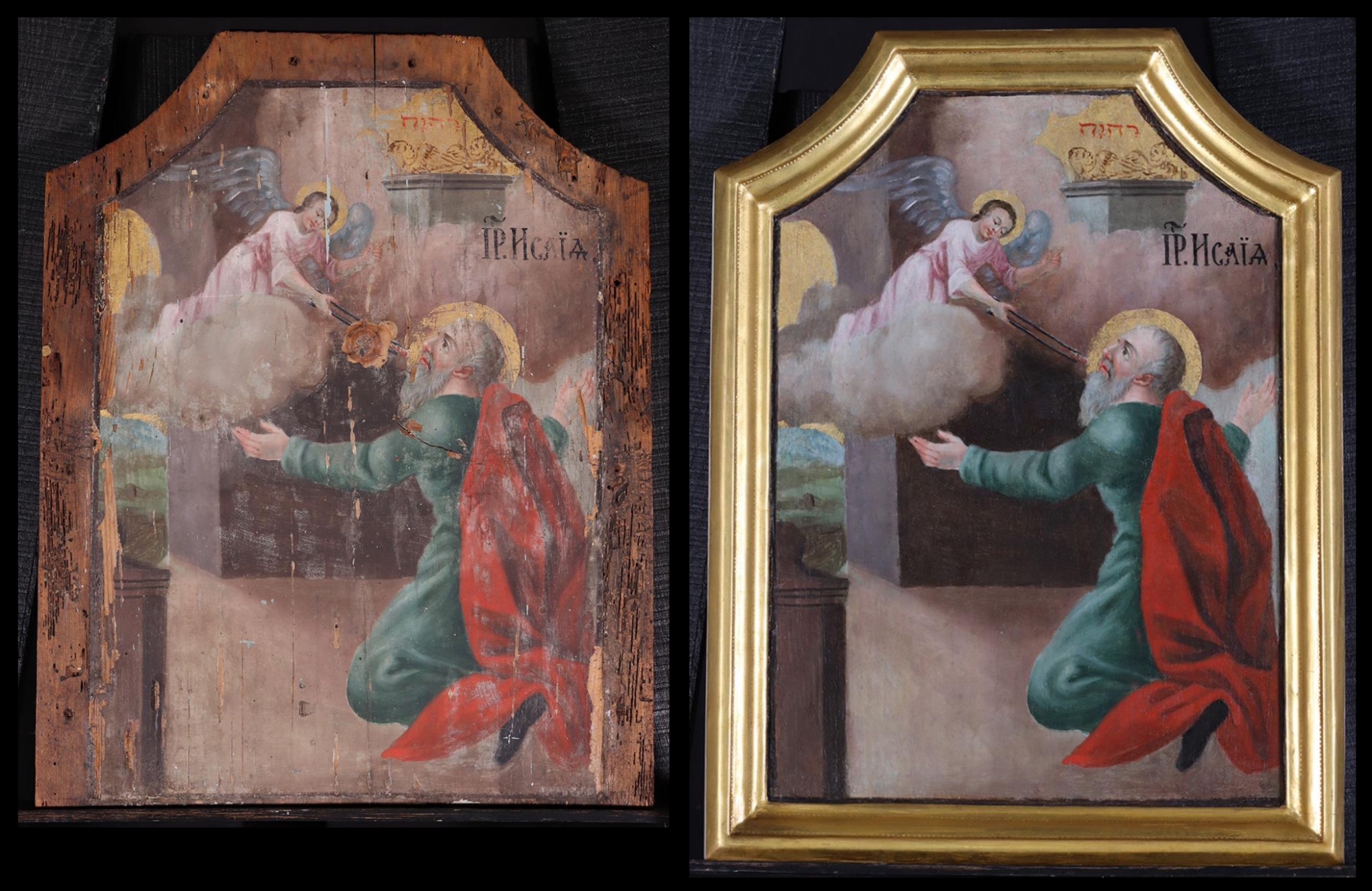 Az ősz szakállú Izajás próféta a templomban térdel kitárt karokkal. Az épületet betöltő fényességben és füstben a felhők közül a szövetség ládája (frigyláda) emelkedik ki, tetején a két kerubbal, akik között évente egyszer az Úr is megjelent. Az aranyozott felületen Isten kinyilatkoztatott neve, JHVH (kiejtve Jahve) olvasható héber betűkkel írva. A Szentírás szerint Izajás az Urat látta a magas és fönséges királyi széken, kit az angyalok így dicsőítettek: „Szent, szent, szent a Seregek Ura, betölti az egész földet dicsősége!” (Iz 6,4) Mire Izajás így szólt: „Jaj nekem, végem van! Mert tisztátalan ajkú ember vagyok, és tisztátalan ajkú nép között lakom, mégis a Királyt, a Seregek Urát látták szemeim!” (Iz 6,5). Ekkor egy szeráf – aki az ikonon Izajás előtt felhőn térdel – csípővassal izzó parazsat vett az oltárról, s ajkához érintette, hogy megtisztítsa bűneitől. Izajás az Úr szavát hallotta, amint ezt kérdezi: „Kit küldjek el? Ki megy el nekünk?” (Iz 6,8). Így válaszolt: „Íme, itt vagyok, engem küldj!” (Iz 6,8). „Menj, és mondd ennek a népnek: ‘Hallván halljatok, de ne értsetek, és látván lássatok, de ne ismerjetek!’ Tedd hájassá e nép szívét, fülét tedd süketté, és szemét ragaszd le, hogy ne lásson szemével, fülével ne halljon, és szívével ne értsen, hogy meg ne térjen, és meg ne gyógyuljon!” (Iz 6,9-10). Így kapta meg Izajás prófétai küldetését Uzija király halála évében (Kr. e. 740), s megjövendölte bűnös népe pusztulását.