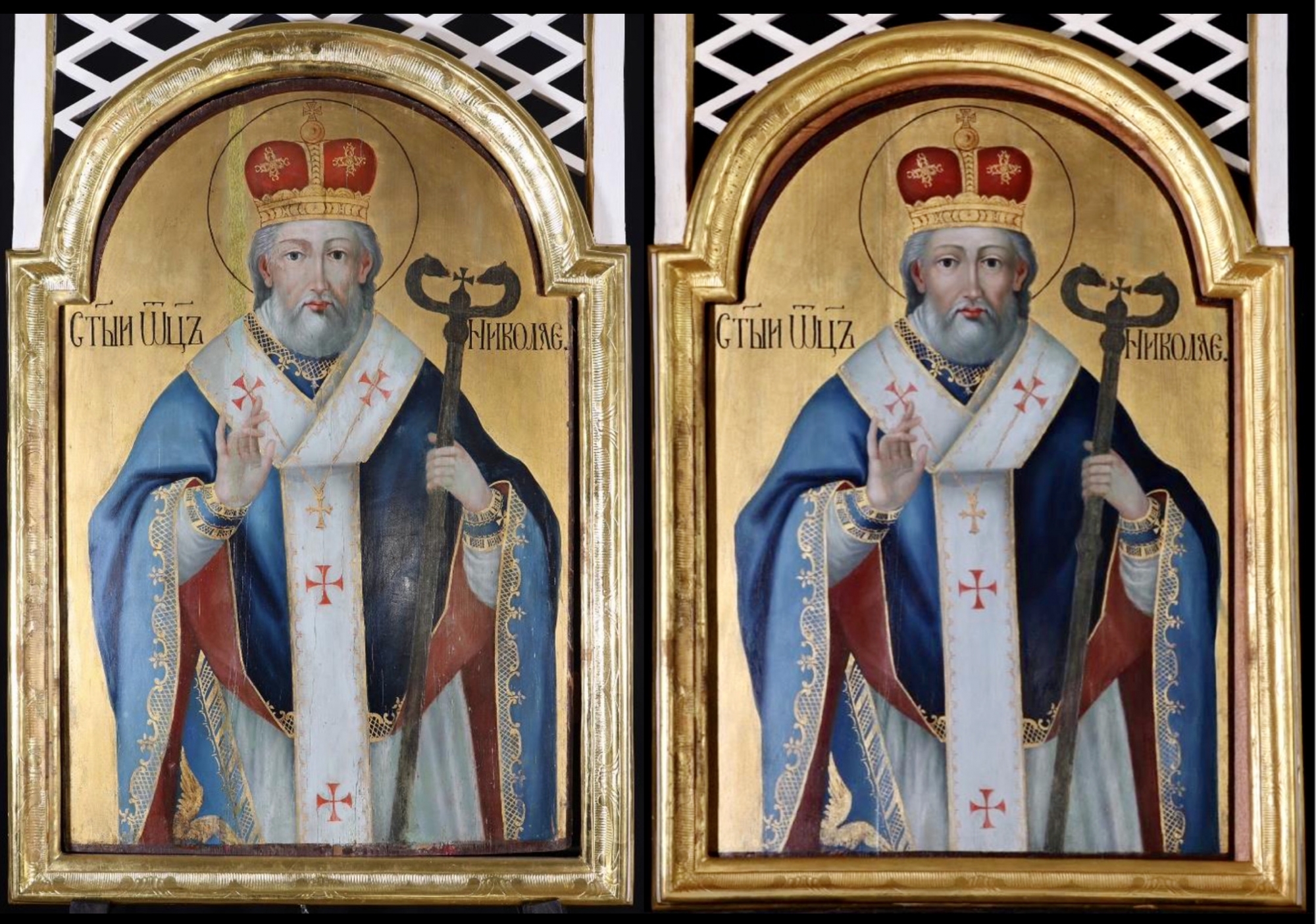 Az északi diakónusi ajtó bal oldalán a bizánci egyház egyik legtiszteltebb szentjének, Csodatévő Szent Miklós püspöknek ikonja foglal helyet. A kisázsiai Patara városából származó Miklós (Kr.u. 245-342), kit a hagyomány szerint égi jel hatására választottak Myra városának püspökévé, püspöki ornátusban látható. Fehér sztichariont (alba), rajta övet és epitrachiliont, amik nem láthatók, kézelőket, oldalán arany szeráffal díszített kék epigonationt (lelki kard), végül vörös bélésű, kék felont és vörös keresztekkel díszített omophoriont, fején mitrát (püspöki korona) visel, nyakában arany kereszt lóg. Jobbjával püspöki áldást oszt, kezének ujjai Jézus Krisztus görög nevének első és utolsó betűit jelzik: „IC-XC”. Baljában keresztben végződő pásztorbotot tart, melyre két egymással szembenéző kígyó csavarodik rá. A hagyomány szerint irgamas szeretete és csodái következtében kezdték tisztelni az utazók, hajózók, kereskedők, zarándokok és a házasság előtt álló lányok, nők védőszentjeként. December 6-án, halálának évfordulóján emlékezünk meg róla.
