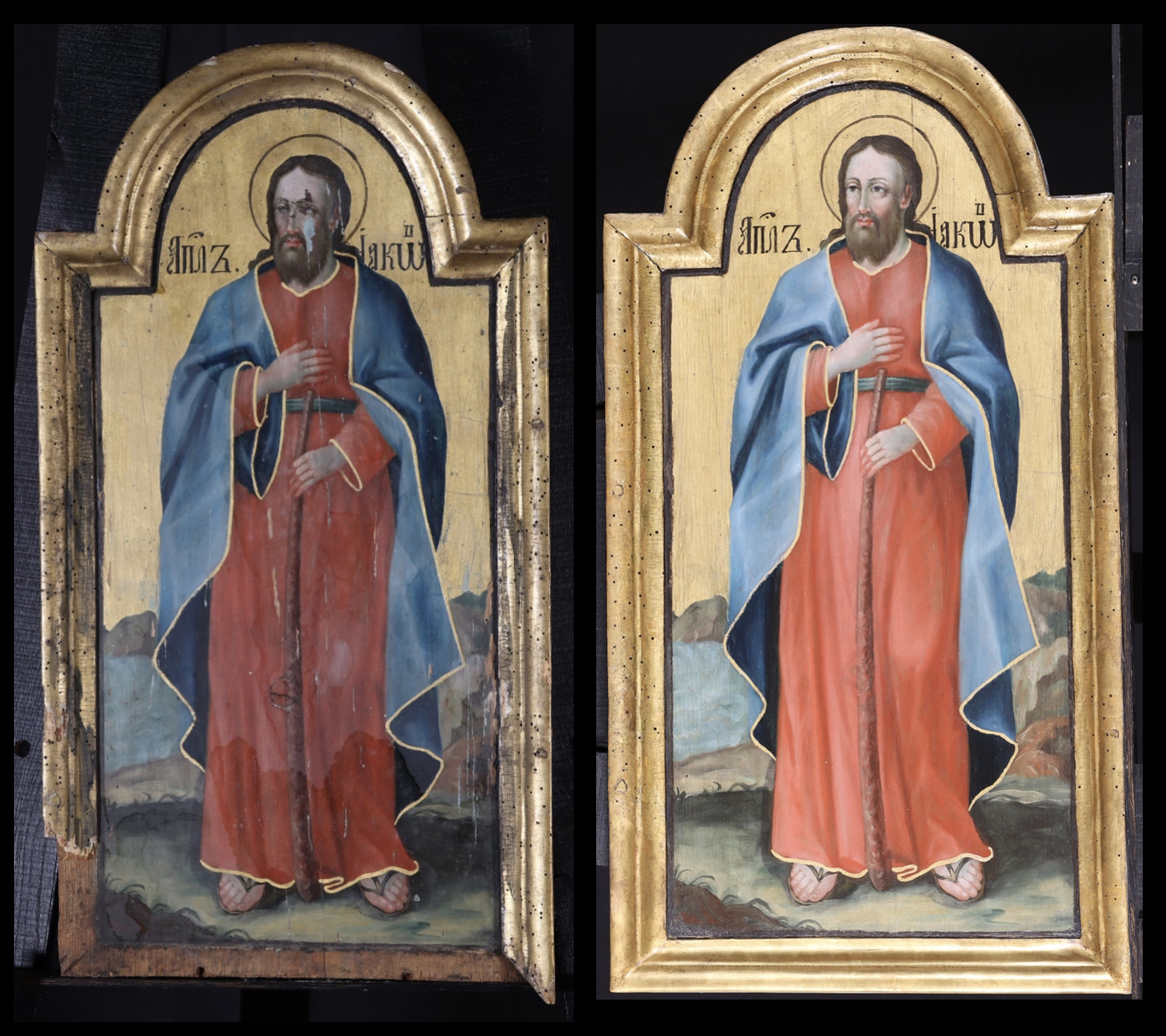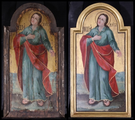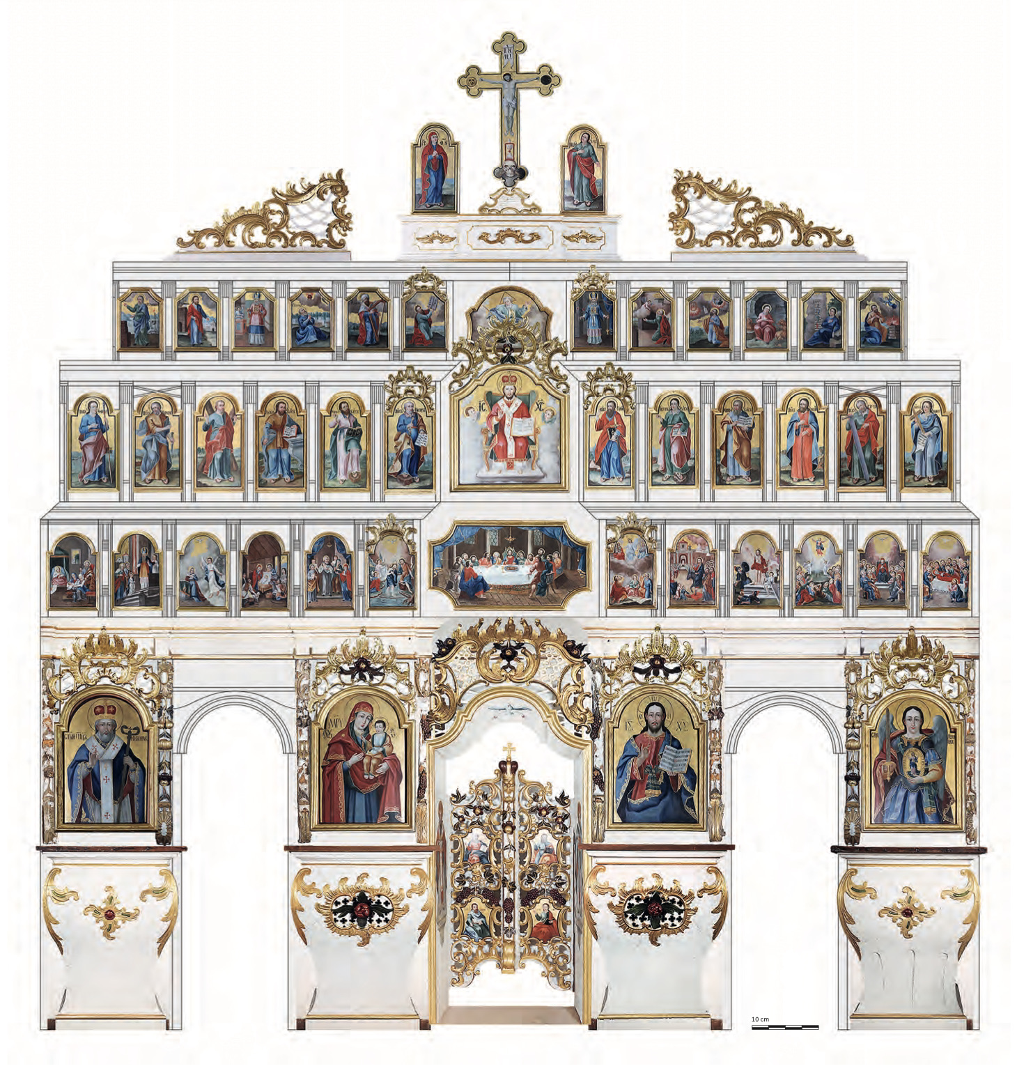 A tizenkét apostol ikonjai: (1.) Szent Tamás apostol, (2.) Szent Bertalan apostol, (3.) Szent András apostol, (4.) Szent Lukács evangélista, (5.) Szent Márk evangélista, (6.) Szent Péter apostol, (7.) Szent Pál apostol, (8.) Szent János evangélista, (9.) Szent Máté evangélista, (10.) Szent Jakab apostol, (11.) Szent Simon apostol, (12.) Szent Fülöp apostol.