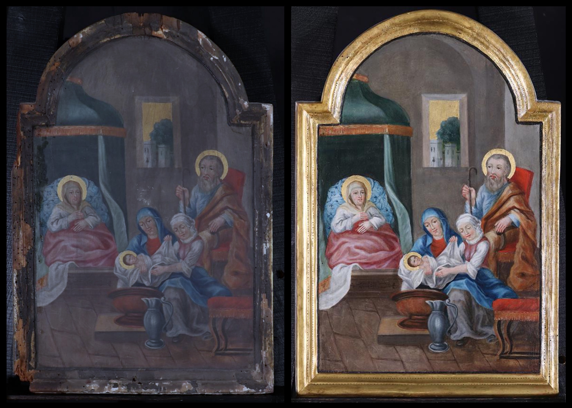 Szűz Mária születése a görögkatolikus egyházi év első nagy ünnepe, melyet szeptember 8-án tartunk. A hagyomány szerint szeptember 8-án, a zsidó újév napján, a világ teremtésének és Ádám születésének ünnepnapján hozta világra az idős Anna régóta vágyott gyermekét a jeruzsálemi Bethesda-fürdő melletti házukban. Az ikonon épületbelső látható, melynek ablakán keresztül talán éppen a jeruzsálemi Juh-kapura nyílik kilátás, melyen a Júda törzséből, Dávid nemzetségéből származó gazdag állatkereskedő, Joakim hálatelt szívvel lépett be Jakab apostol apokrif ősevangéliuma szerint, miután az Úr angyala hírül vitte neki a kosibai barlangba magtalan házassága termékennyé fordulását. A Lévi törzséből származó Anna, kinek ugyancsak megjelent az angyal jeruzsálemi otthonában, a Juh-kapunál várta haza böjtölő férjét az örömteli ígérettel. Az ikonon 9 hónappal későbbi jelenet látható. Anna baldachinos ágyban fekszik takaró alatt, háta párnával megtámasztva. Figyeli, amint újszülöttjét pólyába csavarja két bábaasszony. Lábuknál vizeskancsó és fürdető medence, melyben az imént mosdatták a kisdedet. Joakim az ablak alatt ül vörös kárpitos széken, pásztorbottal a kezében. Az angyal szavai járhatnak gondolataiban, gyermeküket az egész földkerekségen áldani fogják.