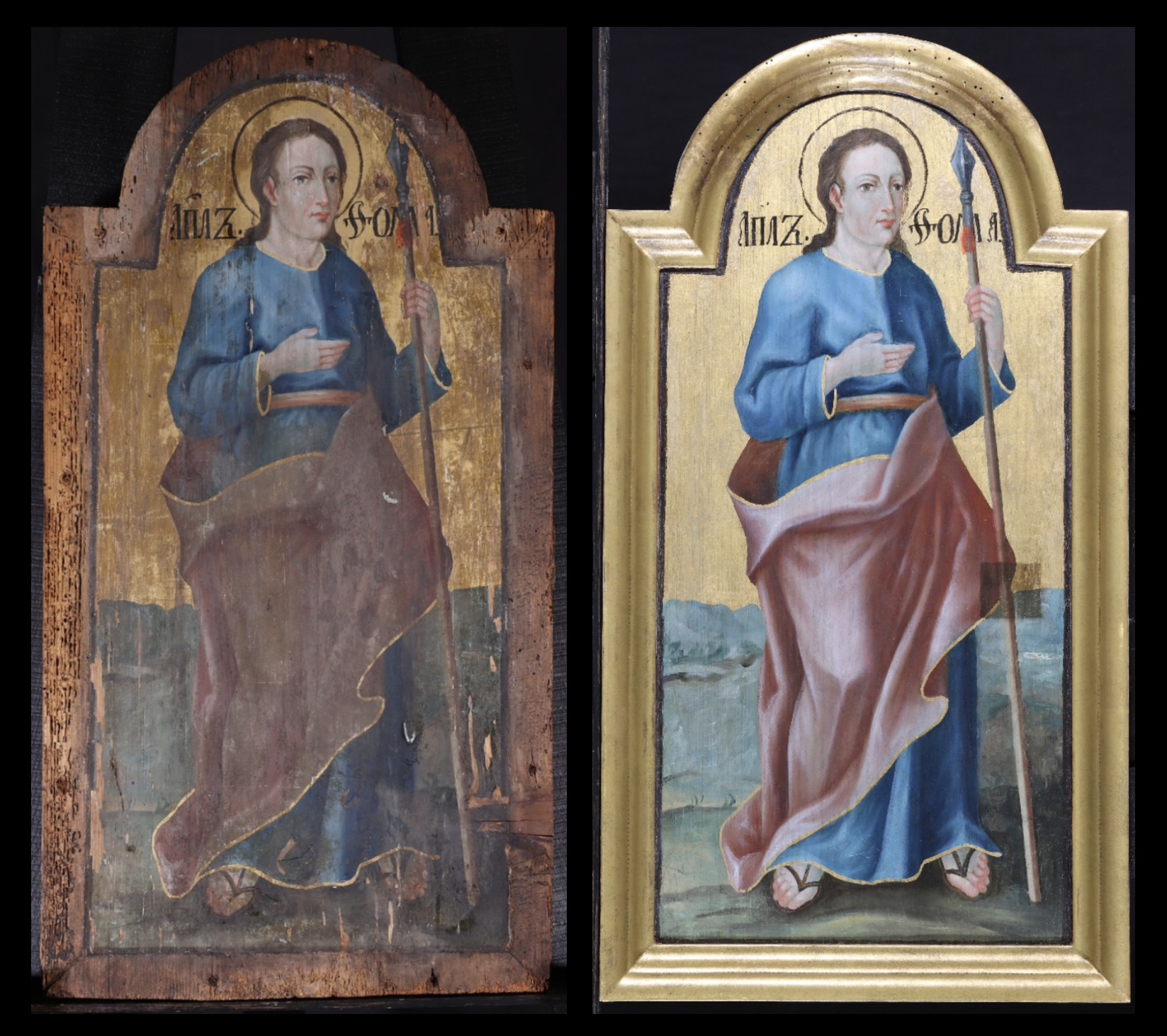 „Hacsak nem látom kezén a szegek nyomát, és ujjamat a szegek helyére nem teszem, és kezemet az oldalába nem helyezem, én nem hiszem!” (Jn 20,25) – mondta Tamás apostol, a tizenkettő egyike, mikor a Feltámadott megjelent tanítványainak. A “hitetlen”, aki Krisztus lándzsa által döfött oldalsebét érintette, a hagyomány szerint katonák lándzsáitól megsebesítve halt vértanúhalált Indiában, ahol a kereszténységet terjesztette. A szakáll nélkül ábrázolt fiatal apostol vértanúságának eszközét, az attribútumává vált lándzsát fogja bal kezében, jobb kezét szívére helyezi.