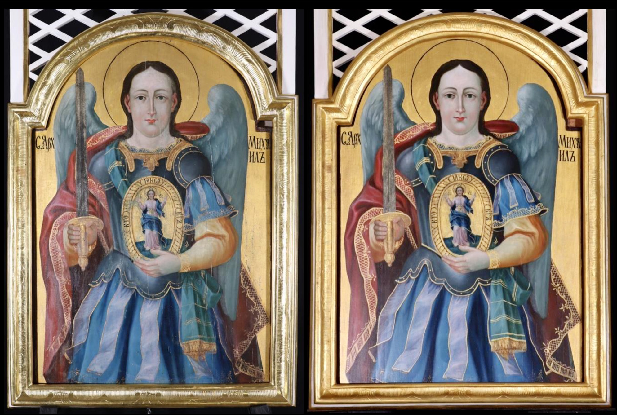 A déli diakónusi ajtó jobb oldalán a templom védőszentjének ikonja foglal helyet. A fiatal férfiként nagy szárnyakkal és nimbusszal ábrázolt Szent Mihály arkangyal a bizánci képtípust követi. Az angyalok seregének fővezére (archisztratégosz) és győztes harcosa jobbjában kétélű kardot tart, mellyel a paradicsom kapuját őrzi a bukott angyalokkal szemben, s a hívő lelkeket erősíti, védelmezi a gonoszlélektől az élet küzdelmeiben és kísértéseiben. Jobb karján és hátán átvetve vörös palást látható. Kék ingén szürke páncélt visel, mely alól szalagok lógnak ki. A mellkasát keresztező szalagon ovális pajzsként Jézus Krisztus képét viseli, bal kezével maga előtt tartja. Az aranyozott pajzson a megdicsőült Üdvözítő áld két kézzel. A pajzson körbefutó egyházi szláv felirat Mihály nevére utal, mely a héber „mi ká él” = „ki olyan, mint az Isten?” kifejezésből ered. A főangyal az egyetlen, senkihez sem mérhető, hatalmas Isten győzelmét hirdeti, az Ő szolgálatában áll. A görögkatolikus egyházban november 8-án tartják ünnepnapját.