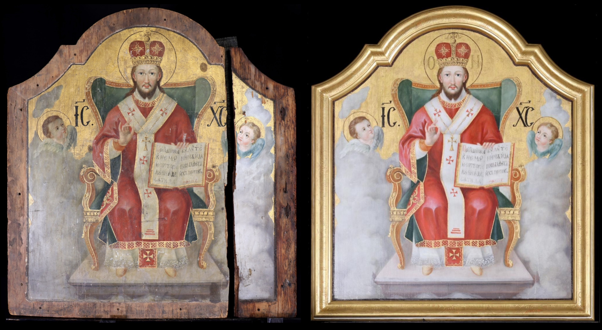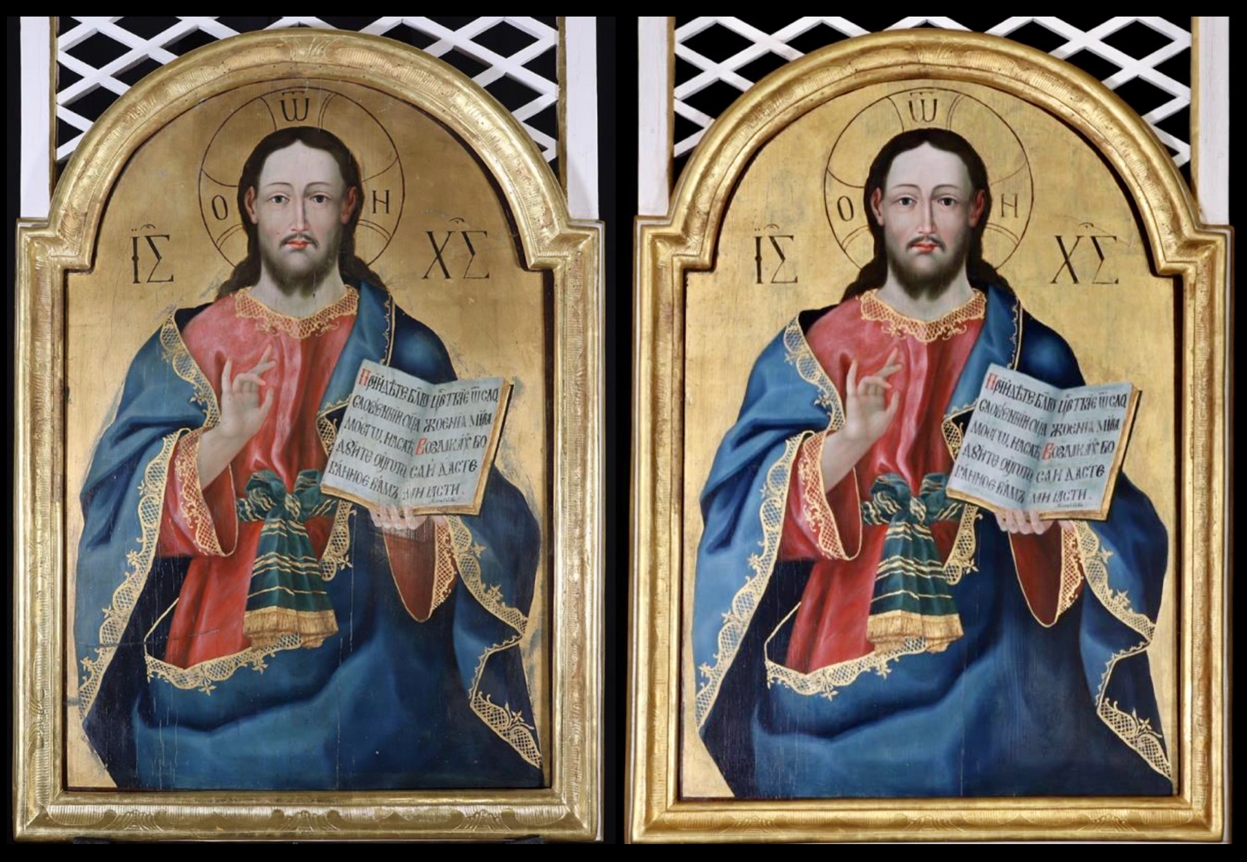 A királyi ajtó jobb oldalán a tanító Krisztus ikonja foglal helyet, ábrázolása a bizánci képtípust követi. Ő az Atya képmása, aki azt mondta magáról Mózesnek az égő csipkebokorban: “Én vagyok az, ‘Aki vagyok’.” (Kiv 3,14) Erre utal glóriájának három görög betűje (ο ώυ), melynek jelentése: Aki van. A létező. Vörös tunikája fölé vett kék köntösének színe azt jelképezi, hogy isteni természetére földi természetet öltött megtestesülésével. Derekát zöld öv fogja át, masnira kötve. Jobbjával áldást oszt, kezének ujjai görög nevének első és utolsó betűit jelzik: „IC-XC”. Baljában nyitott könyvet tart, lapjain egyházi szláv nyelven Máté evangéliumának egy sora olvasható az utolsó ítéletről. A király dicsőséges trónjáról így szól a jobbjára állított igazakhoz: „Jöjjetek, Atyám áldottai, vegyétek birtokba az országot, amely nektek készült a világ teremtése óta. Mert éheztem és ennem adtatok (...)” (Mt 25,34-35). Az evangélium szövege így folytatódik: „ (...) szomjaztam és innom adtatok, idegen voltam és befogadtatok engem, mezítelen voltam és felöltöztettetek, beteg voltam és meglátogattatok, fogságban voltam és eljöttetek hozzám.” (Mt 25,35-36) „Bizony, mondom nektek: amikor megtettétek ezt egynek e legkisebb testvéreim közül, nekem tettétek.” (Mt 25,40)