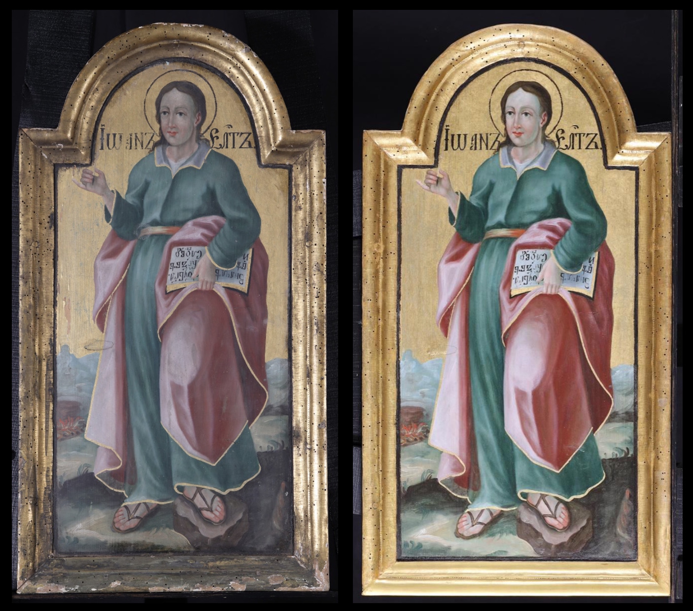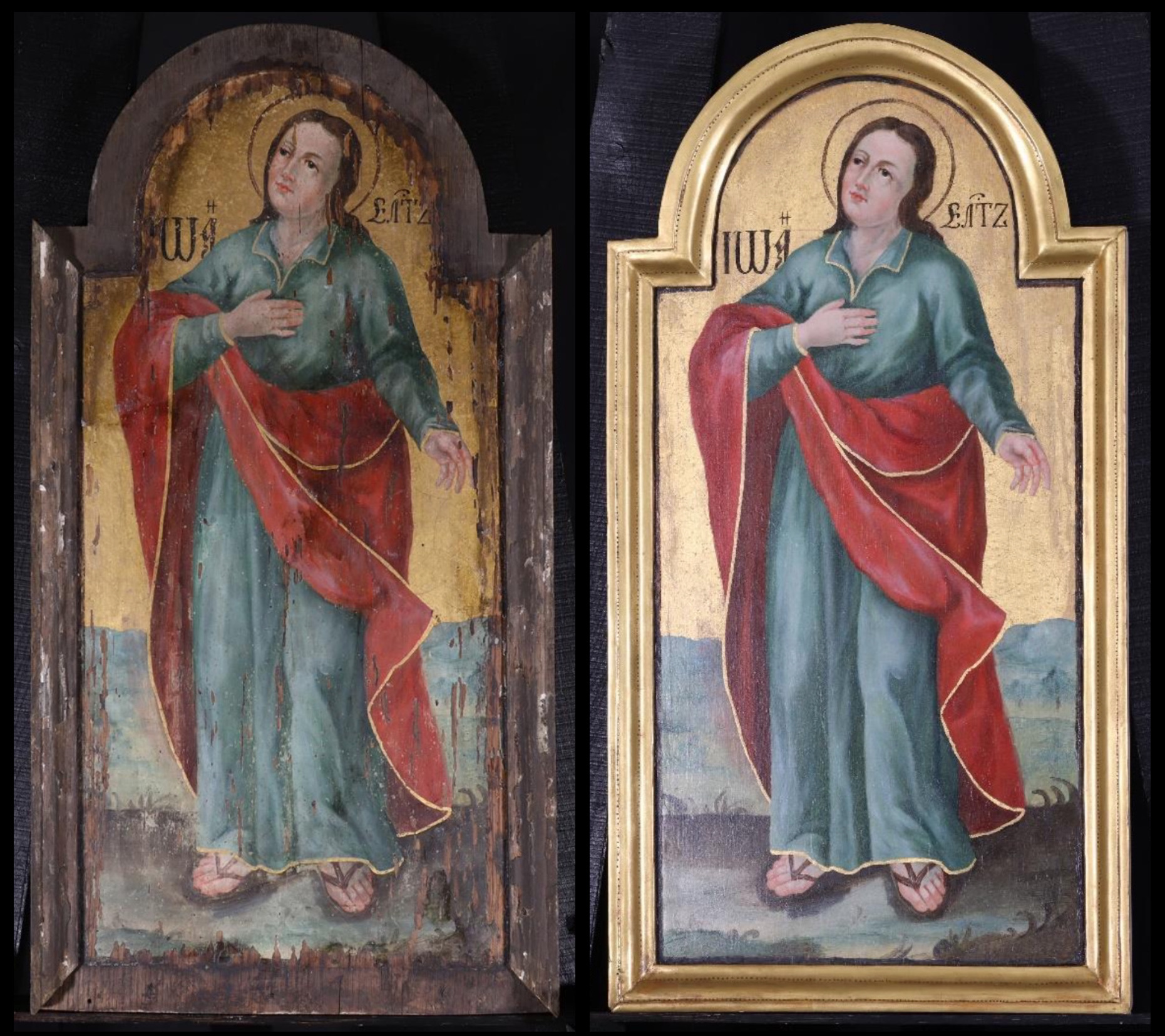 János, a galileai Betániából származó halász, id. Jakab testvére volt a legfiatalabb a tizenkettő közül, Jézus mégis neki adta a legmélyebb bepillantást misztériumába, s őrá bízta a kereszt alatt anyját, Máriát. A hagyomány szerint epheszoszi tartózkodása alatt írta meg Evangéliumát, melyben bemutatja a Szűzanyát is Jézus működésének kezdetén és végén. A szakáll nélkül ábrázolt ifjú bal lábát egy kövön nyugtatja, jobb kezében íróvesszőt, bal kezében Evangéliumos könyvet tart, melynek lapjain Evangéliumának bevezető sora olvasható egyházi szláv nyelven: „Kezdetben volt az Ige, és az Ige Istennél volt, és Isten volt az Ige.” (Jn 1,1) A táji háttérben egy üst alatt fellobbanó tűz arra utal, mikor Domitianus idején sértetlenül szabadult a forró olajból. Természetes halállal halt meg nagyon öregen.