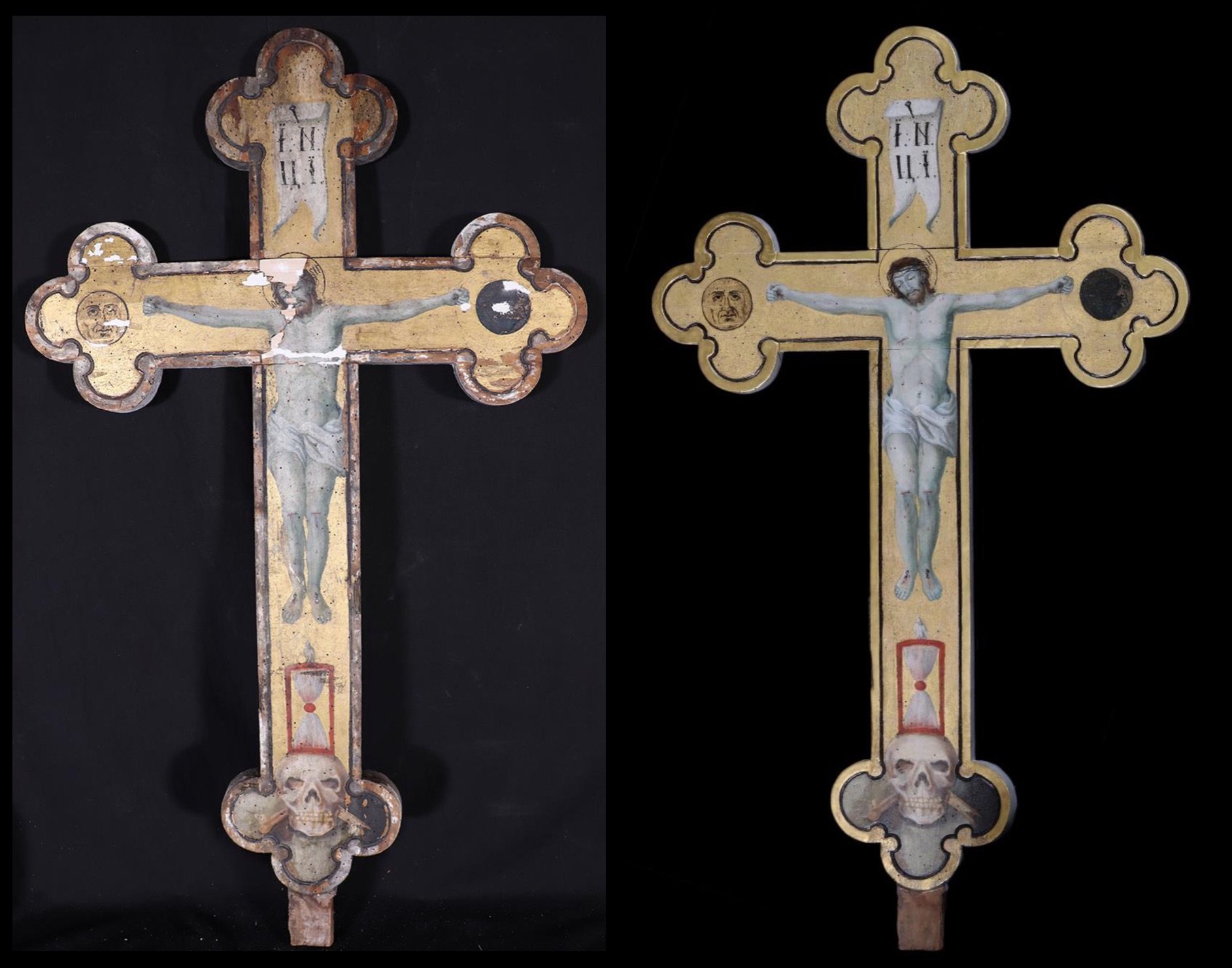 Az aranyozott hátterű, háromkaréjos szárú kereszten a töviskoronás Krisztus függ, kit a bizánci hagyomány szerint négy szeggel megfeszítve ábrázolt az ikonfestő. Feje fölött a Pilátus által megszabott felirat szláv fordításának cirill kezdő betűi olvashatók a fehér mondatszalagon: I.Н.Ц.I. (A Názáreti Jézus, a zsidók királya.) Alatta a mulandóság szimbólumai láthatók: az emberi koponya lábszárcsontokkal, és a homokóra, melyen egy galamb ül. Egy legenda szerint Ádám sírja felett feszítették keresztre Jézust a Koponya-hegyen, melyet héberül Golgotának neveznek. A halálfej és a kereszt összekapcsolása arra utal, hogy Krisztus, a második Ádám magára vette a paradicsomi első Ádám bűnét, és legyőzte a halált. “Ezt mondja az Írás is: »Ádám, az első ember élő lénnyé lett«, az utolsó Ádám pedig éltető Lélekké.” (1Kor 15,45) A kereszt vízszintes szárának két végén két égitest, a Nap és a Hold láthatók, melyek Jézus halálának körülményeire utalnak: “A hatodik óra körül sötétség támadt az egész földön, a kilencedik óráig. A nap elsötétedett, a templom függönye középen kettéhasadt. Jézus ekkor hangosan felkiáltott: »Atyám! Kezedbe ajánlom lelkemet!« E szavakkal kilehelte a lelkét.” (Lk 23,44-46)