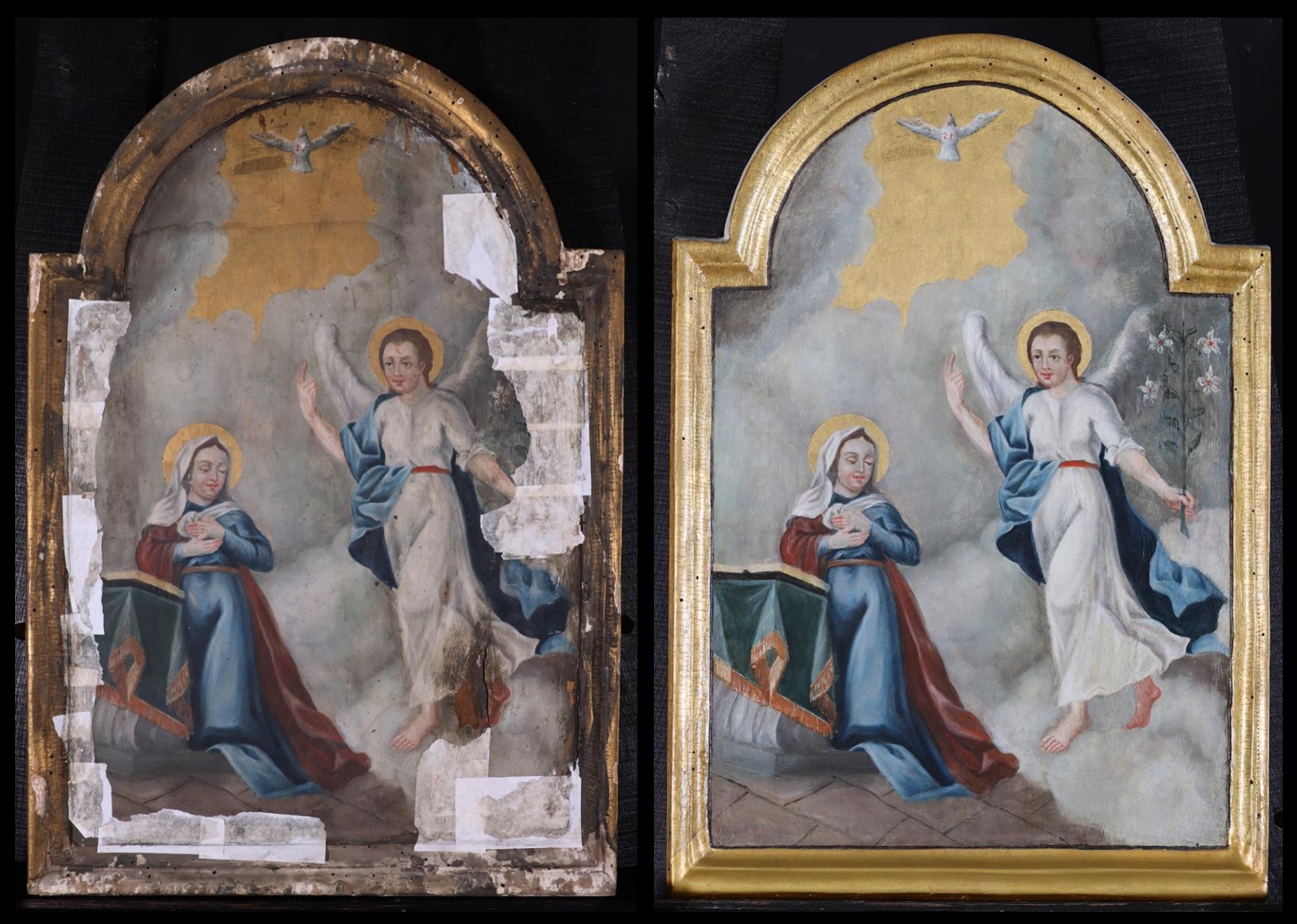 Az angyali üdvözlet hagyományos ünnepnapja március 25-e (Gyümölcsoltó Boldogasszony). A keleti hagyomány szerint Joakim és Anna már nem éltek, mikor a 12 éves Máriának el kellett hagynia a jeruzsálemi templomot, ezért rokonai, Zakariás és Erzsébet gondoskodtak számára olyan férjről, aki tiszteletben tartja szüzességi fogadalmát. Így került Heródes pazar templomából a Dávid-házából való József egyszerű názáreti otthonába, ahol az özvegy férfi családja körében élt. Ekkor történt, hogy Isten elküldte Gábor arkangyalt a galileai Názáretben élő Szűzhöz a Megváltó születésének hírével. Mária az ikonon egy olvasópult előtt térdel, az angyal Isten dicsőítése, imádság közben lepte meg. „»Üdvözlégy, kegyelemmel teljes, az Úr van teveled.« Őt zavarba ejtette ez a beszéd, és elgondolkodott, hogy miféle köszöntés ez. Az angyal pedig folytatta:»Ne félj, Mária! Kegyelmet találtál Istennél. Íme, méhedben fogansz és fiút szülsz, és Jézusnak fogod nevezni. Nagy lesz ő, a Magasságbeli Fiának fogják hívni; az Úr Isten neki adja atyjának, Dávidnak trónját, és uralkodni fog Jákob házában mindörökké, és királyságának nem lesz vége«.” (Lk 1,28-33) Gábor arkangyal bal kezében fehér liliomot, a tisztaság szimbólumát tartja, jobb kezével a magasba mutat. A Szentlélek galamb képében száll le a Szűzre, aki két kezét szívére helyezi, s úgy mondja: „Ime, az Úr szolgálóleánya, legyen nekem a te igéd szerint.” (Lk 1,38) Ez a kompozíció a nyugati ikonográfiai hagyományt követi.