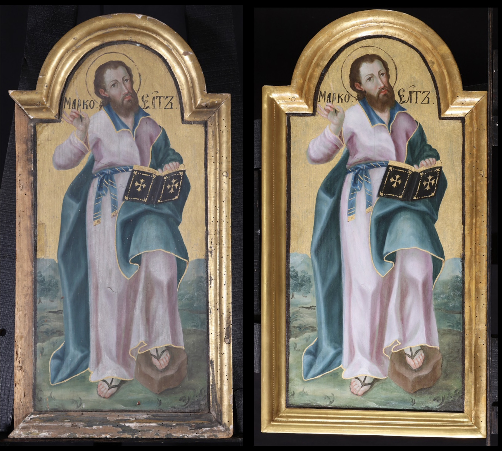 Szent Márk Lévi törzséből származó pap volt. Péter apostol követője, utazásai során társa és tolmácsa. Evangéliumát Szent Péter prédikációi alapján írta meg. Ő küldte Egyiptomba is, ahol Alexandria első püspöke lett. Úgy alakította az embereket, ahogy a kalapács a forró vasat, ezért is vált Marcus, azaz “nehéz kalapács” néven ismertté, holott eredetileg Johanannak hívták. A barna szakállú Szent Márk bal lábát egy kövön nyugtatja, jobb kezében íróvesszőt, baljában fekete borítójú evangéliumos könyvet tart.