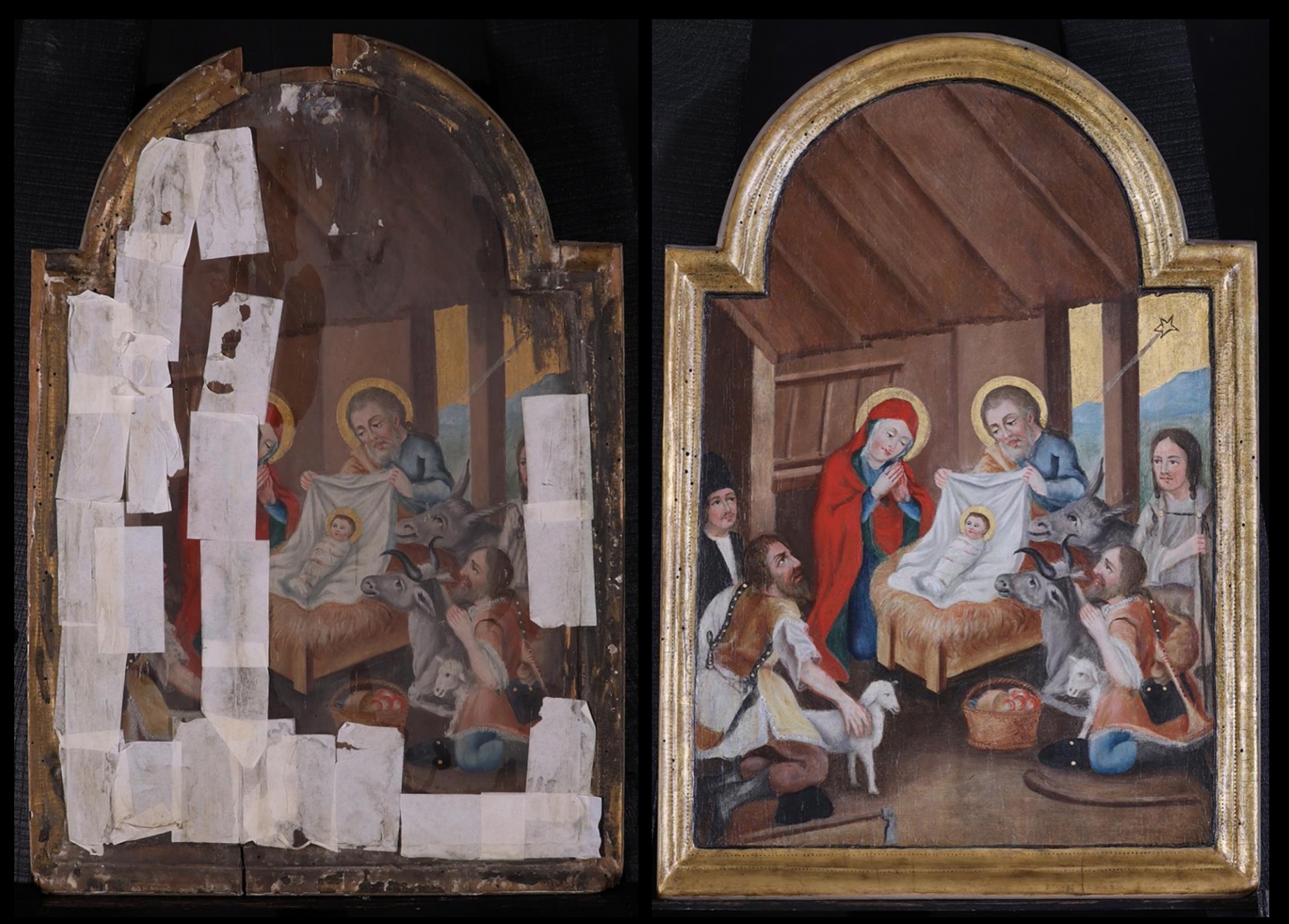 A megtestesülés csodáját, Jézus Krisztus születését december 25-én ünnepeljük. Isten báránya egy barlangistállóban jött világra a júdeai Betlehemben, ahova népszámlálás miatt érkezett a názáreti József feleségével Quirinus idején. Mária hozományként örökölte atyja, Joakim birtokait, ezért kellett megtennie a 3 napos utat várandóssága késői időszakában. Bár mindketten a betlehemi Dávid leszármazottai voltak, mégsem kaptak szállást, hiszen a húsvét nagy ünnepének közeledtével egy várandós nő nem tehette tisztátalanná a házat a zsidó törvény szerint. „Ez lesz a jel számotokra: találni fogtok egy kisdedet pólyába takarva és jászolba fektetve.” (Lk 2,12) - adta hírül az Üdvözítő születését az angyal a környéken éjszakázó pásztoroknak. Az ikonon szalmatetős istállóban térdelnek a pásztorok a jászol körül állataikkal. Öltözékük és jellegzetes hajviseletük a szemlélőt az ikon készítésének idejébe, a 18. századba helyezi. Mind a négyen az Istengyermek előtt hódolnak, kit az ősz szakállú József mutat fel nekik, miközben az Istenszülő imára kulcsolt kézzel hallgatja elbeszéléseiket, amiket a gyermek felől hallottak. „Mária pedig megjegyezte mindezeket a dolgokat, és el-elgondolkodott rajtuk szívében.” (Lk 2,19) „Dicsőség a magasságban Istennek, és a földön békesség a jóakaratú emberekben!” (Lk 2,14) - zengték az angyalok. Azon az éjszakán új csillag ragyogott fel az égen, mely a pogány „napkeleti bölcseket” is elvezette az Üdvözítőhöz.