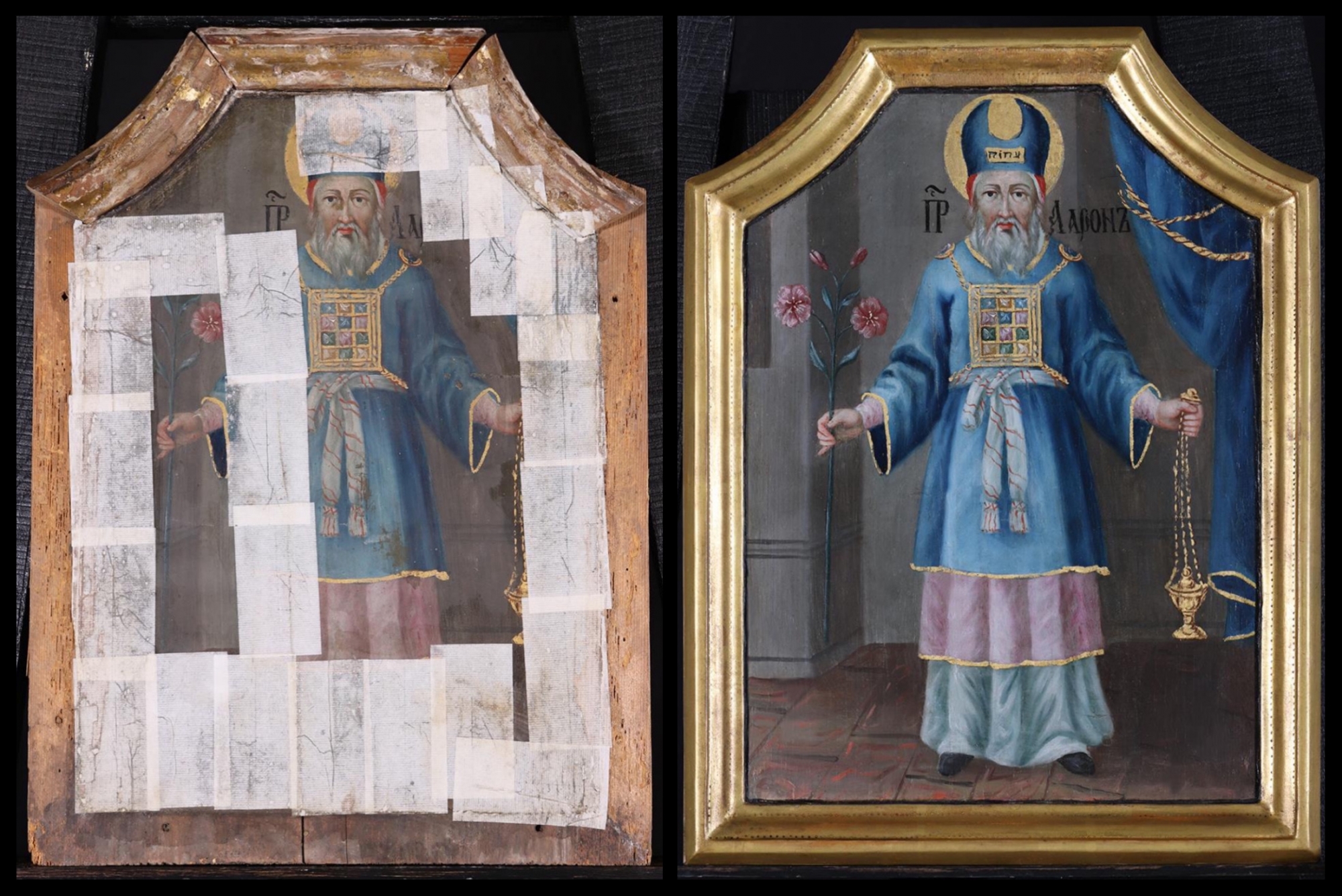 A Lévi törzséből származó Áron, kit testvére, Mózes próféta kent fel Izrael első papjává, főpapi öltözetben látható.“Felöltöztette a főpapot a gyolcs alsóköntösbe, átövezte az övvel, ráadta a kék köntöst, efölé rátette a vállruhát, azt megszorította az övvel, s ráillesztette a tudakolót, amelyben az Urim és a Tumim volt, aztán befödte fejét a süveggel, arra meg elöl rátette a szenteléssel megszentelt aranylemezt, úgy, ahogy az Úr megparancsolta neki.” (Lev 8,7-8) Felkenésétől kezdve csak ő léphetett a szent sátorba, melynek függönye eltakarta a szövetség ládáját a szentélyben. Erre a függönyre utalhat az ikon jobb oldalán elkötött függöny. Áron baljában az áldozati szertartásokhoz használt arany füstölőt, jobbjában a kivirágzott mandulavesszőt tartja. Mandulavesszőt kellett elhelyeznie ugyanis minden törzsnek az Úr előtt. “Ezeket Mózes odatette a bizonyság sátrában az Úr elé, s amikor másnap visszatért, azt találta, hogy a Lévi házából való Áron vesszeje kihajtott, a duzzadó bimbókból virágok fakadtak, s azok kitárták szirmaikat és mandulává alakultak.” (Szám 17,22-23) Áron kivirágzott vesszeje – mellyel Isten a lázadó nép előtt is megerősítette, hogy őmaga választotta ki erre a szolgálatra – ószövetségi előképe Mária szűzi anyaságának, az egyházatyák szerint Krisztus föltámadásának.