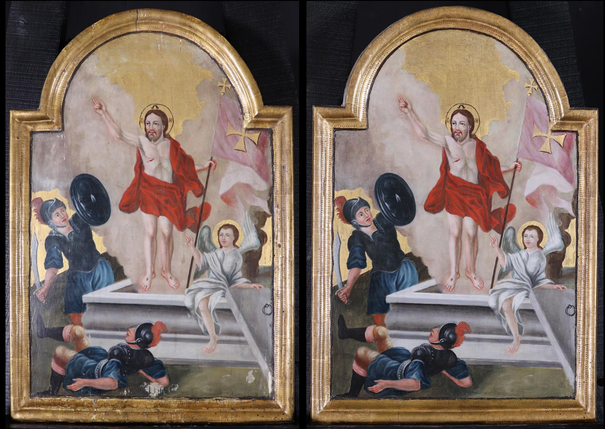 “Krisztus föltámadt! Valóban föltámadt! – köszöntik egymást a keresztények húsvét vasárnapján. A húsvétra virradó reggelen nemcsak a Golgota közeli szentsír bejárata vált szabaddá, miután az Úr angyala elhengerítette előle a zárókövet, de az örök élet kapuja is megnyílt az emberiség számára. Még a föld is beleremegett az üdvtörténet legnagyobb eseményébe, a sírt őrző katonák halálra rémültek az angyal láttán. Az ikonon győzelmesen emelkedik ki sírjából a feltámadt Krisztus bal kezében lobogót tartva. Áldó jobbjának kinyújtott hüvelyk-, mutató- és középső ujjai isteni és emberi (3+2) természetére utalnak. A sírról leemelt kőlap mellett az Úr angyala virraszt. Jézus betániai Máriának mondott szavai jutnak eszünkbe: „Én vagyok a föltámadás és az élet. Aki hisz bennem, még ha meg is halt, élni fog, és mindaz, aki él és hisz bennem, nem hal meg soha.” (Jn 11,25-26) Önfeláldozásával teljesítette be ígéretét, hogy ne csak felébressze romlandó, megszégyenült, gyenge, érzéki testükben a “Lázárokat”, de újjá is teremtse őket Ádámig és Éváig visszamenően, romolhatatlan, dicsőséges, erős, lelki testben az örök életre. „Miért rémültetek meg, és miért támad kétely szívetekben? Nézzétek meg a kezemet és lábamat, hogy valóban én vagyok! Tapintsatok meg, és lássátok, mert a szellemnek nincs húsa és csontja, de amint látjátok, nekem van.” (Lk 24,38-39) - mondta apostolainak látogatásakor. “Boldogok, akik nem láttak, és mégis hittek.” (Jn 20,29)