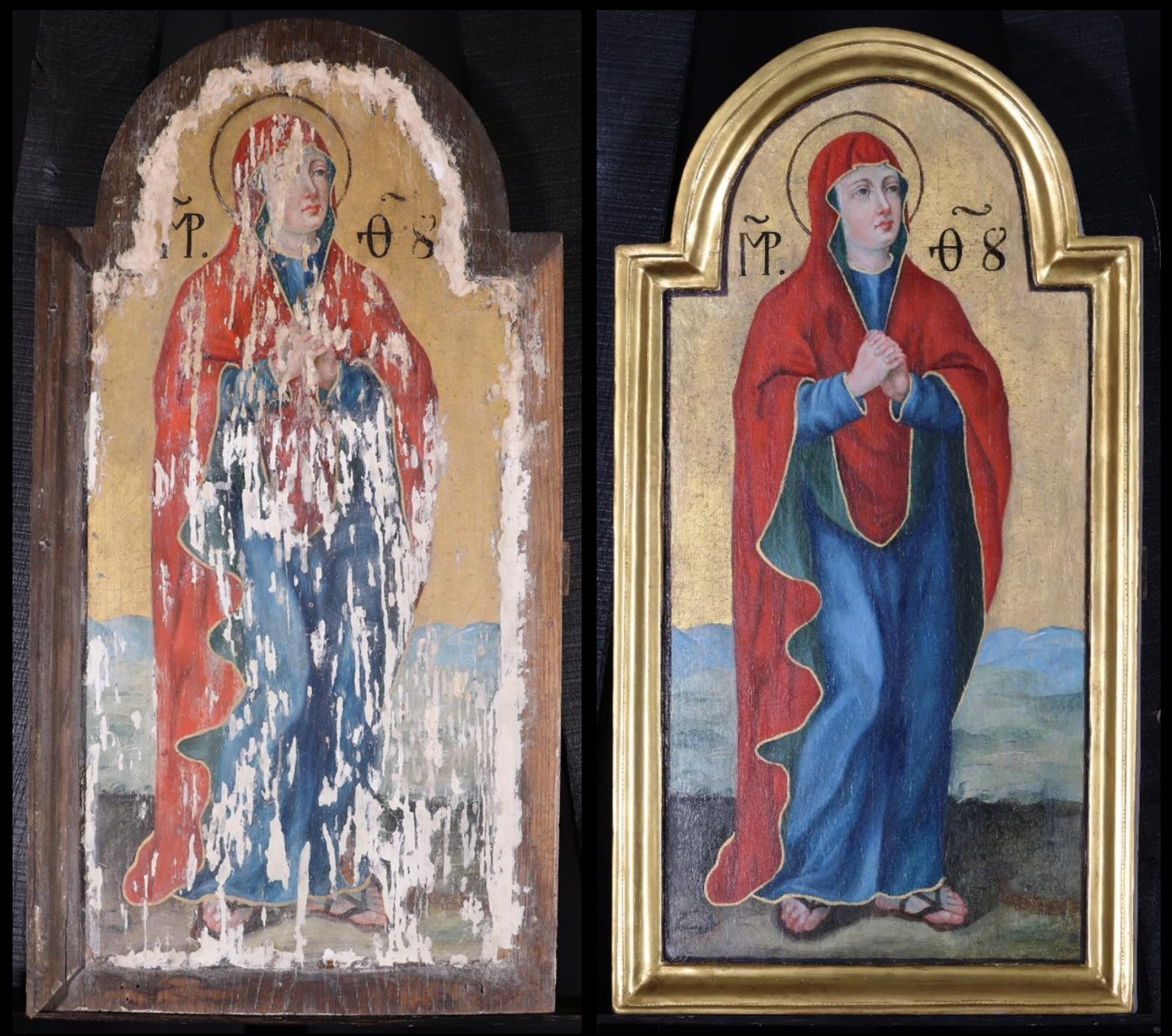 Az Istenszülő imára kulcsolt kézzel áll a kopár Golgotán, s a keresztre tekint. Kék tunikája felett zöld bélésű vörös maforiont (az Istenszülő oltalmazó köpenye) visel. Ruházatának színe, a kék fölé vett vörös ruhadarab azt fejezi ki, hogy a földi halandók között a szentség legmagasabb fokát érte el. A fájdalmak közepette is közel akart lenni Szent Fiához, s közben hét tőr járta át szívét, ahogy azt az öreg Simeon megjövendölte. “Amikor Jézus látta, hogy ott áll az anyja és szeretett tanítványa, így szólt anyjához: »Asszony, nézd, a fiad! «” (Jn 19,26) Az angyalnak mondott „igen” után Fiának is „igent” mondott, majd a megváltás „beteljesedett”.