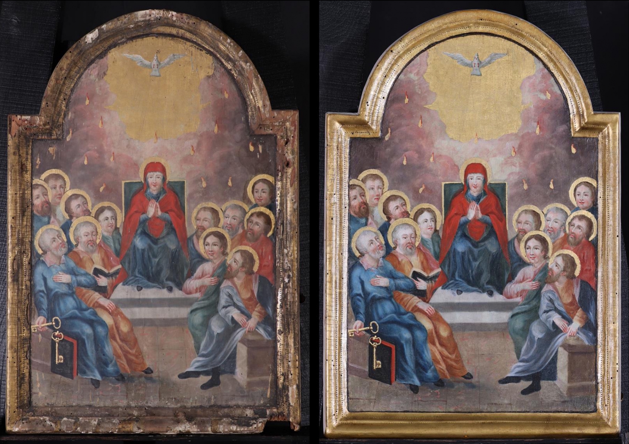 Húsvét után ötven nappal, pünkösdkor a Szentlélek kiáradását ünnepeljük. Isten a Mózes által kihirdetett Törvény emléknapján égette bele szeretetének parancsait az apostolok szívébe. “Hirtelen zaj támadt az égből, olyan, mint a heves szélvész zúgása. Betöltötte az egész házat, ahol ültek. Majd pedig szétoszló nyelvek jelentek meg nekik, olyanok, mint a tűz, és leereszkedtek mindegyikükre.” (ApCsel 2,2-3) Ekkor született meg az Egyház. Az ikonon a félkörben ülő apostolok között az Egyház minta- és előképe, Szűz Mária trónon ül. A Szentlélekre utaló galamb lebeg felette, mint az Angyali üdvözletkor, mikor Isten lakást vett benne. “Ujjongj és örvendj, Sion leánya, mert íme, én majd eljövök és benned lakom – mondja az Úr. – Azon a napon majd sok nemzet csatlakozik az Úrhoz és az én népemmé lesznek, és én majd nálad lakom; és te majd megtudod, hogy a Seregek Ura küldött engem hozzád.” (Zak 2,14-15) Az ószövetségi próféta, Zakariás látomása pünkösdkor teljesedett be, mikor Isten a nyelvek csodáján keresztül kapcsolta össze a különböző nyelven beszélő embereket, hogy megértsék apostolai tanúságtételét “egészen a föld határáig”. Az ikon bal szélén ülő Péter az egyház sziklaalapja, kinek Jézustól kapott hatalmát az oldás és kötés, a kulcsok jelképezik. A Szentlélek által tett kinyilatkoztatást pünkösdi beszédében: “Tudja meg tehát Izrael egész háza teljes bizonyossággal, hogy Isten Úrrá és Krisztussá tette őt, azt a Jézust, akit ti keresztre feszítettetek!” (ApCsel 2,36)