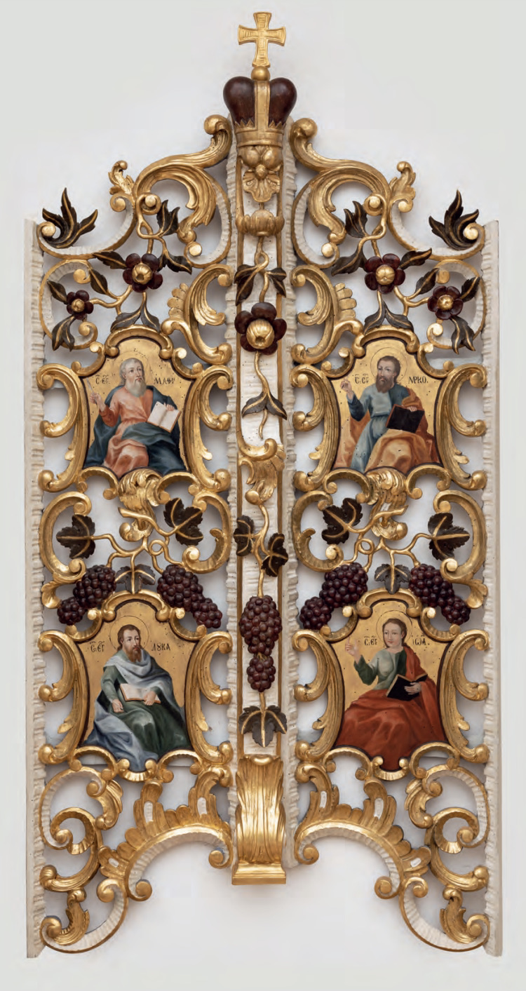 A királyi ajtó bal szárnyán felül az ősz szakállú Máté, alul a barna szakállú Lukács evangélisták képei foglalnak helyet, jobb szárnyán a barna szakállú Márk, alatta pedig az ifjú, szakáll nélküli János evangélisták háromnegyed alakos ábrázolásai láthatók a szőlőindás faragványok között. Míg a bal szárny evangélistái jobb kezükben tollat, bal kezükben nyitott evangéliumos könyvet tartanak, addig a jobb szárnyon fekete borítós, csukott evangéliumos könyvvel szerepelnek az evangélisták.
