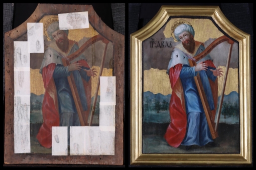 A Betlehemből származó Izáj fia, Dávid pásztor volt, mielőtt a rossz szellemektől gyötrődő Saul udvarába került, kit lantjátékával meggyógyított. Később Júda, majd Izrael királyává is felkenték, s egész Palesztina ura lett a Kr. e. 10. század első felében. A Szentírás hagyománya szerint gyakran játszott hárfán, ő rendelte el az istentiszteleteken való éneklést, és zsoltárokat írt. “Könyörülj rajtam, Isten, irgalmad szerint, könyörületességed szerint töröld el gonoszságomat! Moss egészen tisztára vétkemtől, bűnömtől tisztíts meg engem!” (Zsolt 51,3-4) – írta 50. bűnbánati zsoltárában, miután Nátán próféta szembesítette bűnével. Elcsábította Betsabét, Uriás feleségét, s mivel megszerette az asszonyt, férjét megölette. Igaz bűnbánata mégis megigazulttá tette az Úr előtt. Az ikonfestő táji környezetben, királyi öltözetben, hárfával a kezében ábrázolta a prófétát, Izrael dalainak szerzőjét. Dávidot Jézus előképeként tisztelik, hiszen Izrael pásztora, Izrael királya az Úr prófétája volt. Az ő házából született a Messiás.