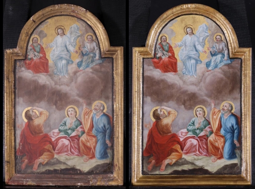 „Ne gondoljátok, hogy azért jöttem, hogy érvénytelenné tegyem a törvényt vagy a prófétákat; nem azért jöttem, hogy érvénytelenné tegyem, hanem hogy beteljesítsem.” (Mt 5,17) – mondta Jézus a hegyi beszédben. Később bepillantást engedett isteni teljességébe három legbizalmasabb tanítványának egy „magas hegyen”, amit a hagyomány a galileai Tábor hegyének tart. Urunk színeváltozásakor – amit augusztus 6-án ünneplünk – Isten összes addigi megjelenése és megnyilatkozása beteljesedett Krisztusban, mikor megjelent a belőle kiáradó fényben a törvényt képviselő Mózes és a prófétákat képviselő Illés, akikkel eltávozásáról beszélgetett. A megrendült apostolok, Péter, Jakab és János ekkor értették meg, mit is készített elő Isten azok számára, akik hisznek benne. Az ikonon Jakab még a szemét is eltakarja, ahogy föltekint a ragyogó arcú, hófehér ruhás Jézusra. Istenfélelem járja át Jánost is, Péter apostol pedig így szól teljes önkívületében: „»Uram, jó nekünk itt lenni! Ha akarod, csinálok itt három sátrat, neked egyet, Mózesnek egyet és Illésnek egyet.« Még beszélt, amikor íme, fényes felhő árnyékolta be őket, s a felhőből egy hang szólt: »Ez az én szeretett Fiam, akiben kedvem telik, őt hallgassátok«.” (Mt 17,4-5) A teremtett világ megdicsőüléséhez egy végső felmagasztalásra is szükség volt, mely a Golgota magaslatán, két lator között, nyilvánosan teljesedett be.
