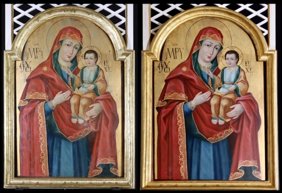 A királyi ajtó bal oldalán az Útmutató Istenszülő ikonja foglal helyet. A kép hodigitria (útmutató) ábrázolás: Mária a bal karján ülő gyermek Jézusra mutat jobbjával. Ábrázolásuk a testtartást, kéztartást, ruharedőket és színeket tekintve is a bizánci képtípust követi. Mária kék tunikája fölött zöld bélésű vörös maforiont visel. Jobb vállán nyolcágú arany csillag látható, mely nem csak szüzességének jelképe. Csillagként mutatja az utat az emberi élet sötét éjszakáján, hogy elvezessen bennünket Szent Fiához, Jézus Krisztushoz, a „világ világosságához”. (1Kor 13,12) “Az igazi világosság, aki minden embert megvilágosít, a világba jött. A világban volt, a világ őáltala lett, de a világ nem ismerte fel őt.” (Jn1,9-10) Jézus Krisztus az Atya dicsőségének visszfénye, erre utal glóriájának három görög betűje (ο ώυ), melynek jelentése: Aki van, A létező. A fehér kitont és zöld bélésű, okkersárga himationt viselő Fiú Isten áldó jobbjának kinyújtott hüvelyk-, mutató- és középső ujjai isteni és emberi (3+2) természetére utalnak. Bal kezében tanítására, az Evangéliumra utaló könyvtekercset tartja. „Mert nálad van az élet forrása, és világosságod által látunk világosságot.” (Zsolt 36,10)