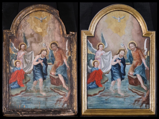 Vízkereszt, Jézus megkeresztelkedésének napja, Úr- vagy Istenjelenésnek is nevezzük, egyházunk egyik legnagyobb ünnepe. A betlehemi jászolban elrejtőző Isten egyre inkább láthatóvá vált a Fiúban, miután keresztelkedésével igent mondott az Atyának. János, aki már anyja méhében eltelt a Szentlélekkel, a Jordán parti Betániában hirdette a keresztséget a bűnök bocsánatára. A farizeusokhoz és szadduceusokhoz intézett szavaira utal az ikon jobb alsó sarkának motívuma, a fejsze: ”A fejsze már a fák gyökerén van. Minden fát ugyanis, amely nem terem jó gyümölcsöt, kivágnak és tűzre vetnek. Én vízzel keresztellek titeket a megtérésre, de aki utánam jön, erősebb nálam: a saruit sem vagyok méltó hordozni. Ő Szentlélekkel és tűzzel fog megkeresztelni titeket.” (Mt 3,10-11) A teveszőrbe öltözött Előkövet baljában keresztben végződő botot tart, rajta fehér textil, amelyet eredetileg mondatszalagnak szánhatott a festő. Féltérdre ereszkedve kagylóból önti a Jordán vizét a Megváltó fejére, aki a folyó közepén kék lepelben áll egy kövön. Ruháját hódoló angyal őrzi a parton, míg a másik angyal fehér kendővel várja. A kő alól előbújó viperák a vízben rejtőző sátáni erőkre utalnak, melyek erejét Krisztus most a vizek megszentelésével töri meg. Az égből galamb képében a Szentlélek száll alá, s szózat hangzik fel:“Te vagy az én szeretett Fiam, benned telik kedvem.” (Lk 3,22) A Szentháromság titka először tárul fel az Evangéliumban.