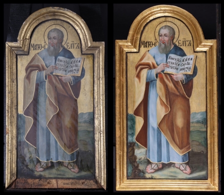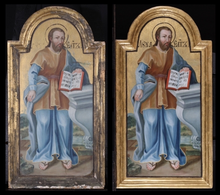 Szent Máté, az első Evangélium szerzője, kafarnaumi vámszedő volt, mielőtt Jézus tanítványává szegődött. Házában mondta Jézus az ítélkező farizeusoknak: ”Nem az egészségeseknek kell az orvos, hanem a betegeknek. Menjetek és tanuljátok meg, mit tesz az: ‘Irgalmasságot akarok, és nem áldozatot’. Nem az igazakat jöttem hívni, hanem a bűnösöket.” (Mt 9,9-13). Az idős, ősz szakállú apostol bal kezében evangéliumos könyvét tartja, jobbjával a benne olvasható egyházi szláv nyelvű idézetre mutat, mely Evangéliumának bevezető sora: „Jézus Krisztus nemzetségtáblája, aki Dávidnak, Ábrahám fiának a fia.” (Mt 1,1)