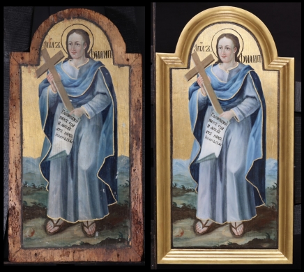 A fiatal, szakáll nélkül ábrázolt Fülöp apostol, aki halász volt Betszaidában, mielőtt Jézushoz csatlakozott, bal kezében könyvtekercset tart, melyen a következő felirat olvasható egyházi szláv nyelven: “Uram, mutasd meg nekünk az Atyát, és az elég nekünk!” (Jn 14,8) Ezt azután kérte, hogy Jézus kinyilatkoztatta magát: „Én vagyok az út, az igazság és az élet. Senki sem jut az Atyához, csak általam.” (Jn 14,6) Majd így felelt tanítványának: „Annyi idő óta veletek vagyok, és nem ismertél meg engem, Fülöp? Aki engem látott, az Atyát látta.” (Jn 14,9) A szent apostol a hagyomány szerint Domitianus császár idejében halt vértanúhalált. A frigiai Hierapoliszban feszítették keresztre, ezért tartja jobbjában vértanúsága eszközét, a keresztet.