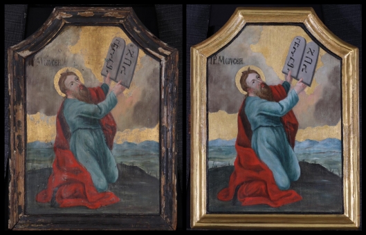 Mózes próféta, aki kivezette népét Egyiptomból, a Sínai-hegy tetején térdel kezében a törvény két táblájával, melyre Isten ujjai írtak. Az Úr szövetséget kötött Izrael népével, s kinyilatkoztatta a tízparancsolatot, melyet kőbe vésve adott át Mózesnek. (Kiv 31,18) “A táblák tele voltak írva mindkét oldalukon: elöl és hátul írás volt rajtuk. Isten maga készítette a táblákat, az írás Isten írása volt, bele volt vésve a táblákba.” (Kiv 32,15-16) Az ikonon a kőtáblákon a héber betűk számértékükkel a parancsok sorrendjét jelölik. Mózest a felhő formájában alászállt Isten dicsősége veszi körül, mely olyannak tűnik, mint az emésztő tűz. Haragra is gyúlt a bálványimádó nép láttán, kik mindeközben aranyborjút öntöttek maguknak. Mózes kiengesztelte imájával, de mikor leért a hegyről, s meglátta a szövetségszegő népet, összetörte dühében a táblákat. A szövetség megújítása után az Úr így szólt hozzá: „Faragj ki magadnak két olyan kőtáblát, mint az elsők voltak. Jöjj fel hozzám a hegyre és ráírom a táblákra azokat a szavakat, amelyek rajta voltak az elsőkön, amelyeket összetörtél.” (Kiv 34,1) Mivel a törvény tábláinak átvételétől kezdve Mózes arcának bőre sugárzott, s a ‘sugárzott’ szó héber töve fénysugárzást és szarvat is jelent, a Vulgata így fordítja: “arcán fény-szarvak nőttek”. Mózes fényszarvai az erő és a hatalom jelei az ószövetségben.