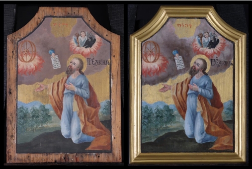 A babiloni fogság idején kapta meg prófétai küldetését a számüzetésben élő pap, Ezekiel, aki az ikonon a Kebár-folyó partján térdel, miközben az Úr dicsőségét szemléli látomásában. A felhők feletti aranyozott felületen Isten kinyilatkoztatott neve, JHVH (kiejtve Jahve) olvasható héber nyelven. Alatta tűzben forgó kerék és szárnyaikat verdeső élőlények láthatók (angyal, oroszlán, sas, bika), akik a Mindenhatót dicsőítik. A Szentírás szerint mind a négy élőlénynek négy különböző arca volt, mellyel mindegyikük négy irányba nézett, s mindegyikük mellett volt egy-egy ragyogó kerék, amik négy irányba haladtak. Az élőlények lelke volt a kerekekben, s a lélek irányította őket. A felhő közepéből az Úr keze kigöngyölt könyvtekercset nyújt Ezekiel felé, “ami bele volt írva, az siralom, gyászének és jajszó volt.” (Ez 2,9). A próféta küldetést kapott az Úrtól, hogy figyelmeztesse népét a bűnt követő ítéletre, s hirdesse a megtéréssel lehetséges szabadulást: „Emberfia, ami előtted van, edd meg; edd meg ezt a tekercset és menj, beszélj Izrael fiaihoz.” (Ez 3,1) Mikor a lélek elragadta Ezekielt, hallotta „az élőlények egymást verdeső szárnyainak csattogását, az élőlényeket kísérő kerekek robogását, meg a nagy földindulás robaját.” (Ez 3,13)