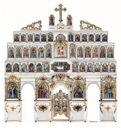 Az Atyához vezető útra “mutat rá” a királyi ajtó bal oldalán látható hodigitria Istenszülő, és a jobb oldalon megjelenített Tanító Krisztus is, kinek evangéliumos könyvében ez áll: „Jöjjetek, Atyám áldottai, vegyétek birtokba az országot, amely nektek készült a világ teremtése óta. Mert éheztem és ennem adtatok...” (Mt 25,34-35). Az északi diakónusi kapu bal oldalán a bizánci egyház egyik legtiszteltebb szentje, Csodatévő Szent Miklós püspök látható, a déli diakónusi kapu jobbján pedig a templom védőszentje, Szent Mihály arkangyal foglal helyet (ünnepe: november 8.).