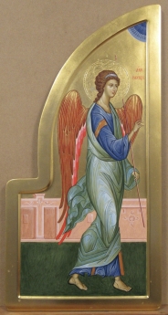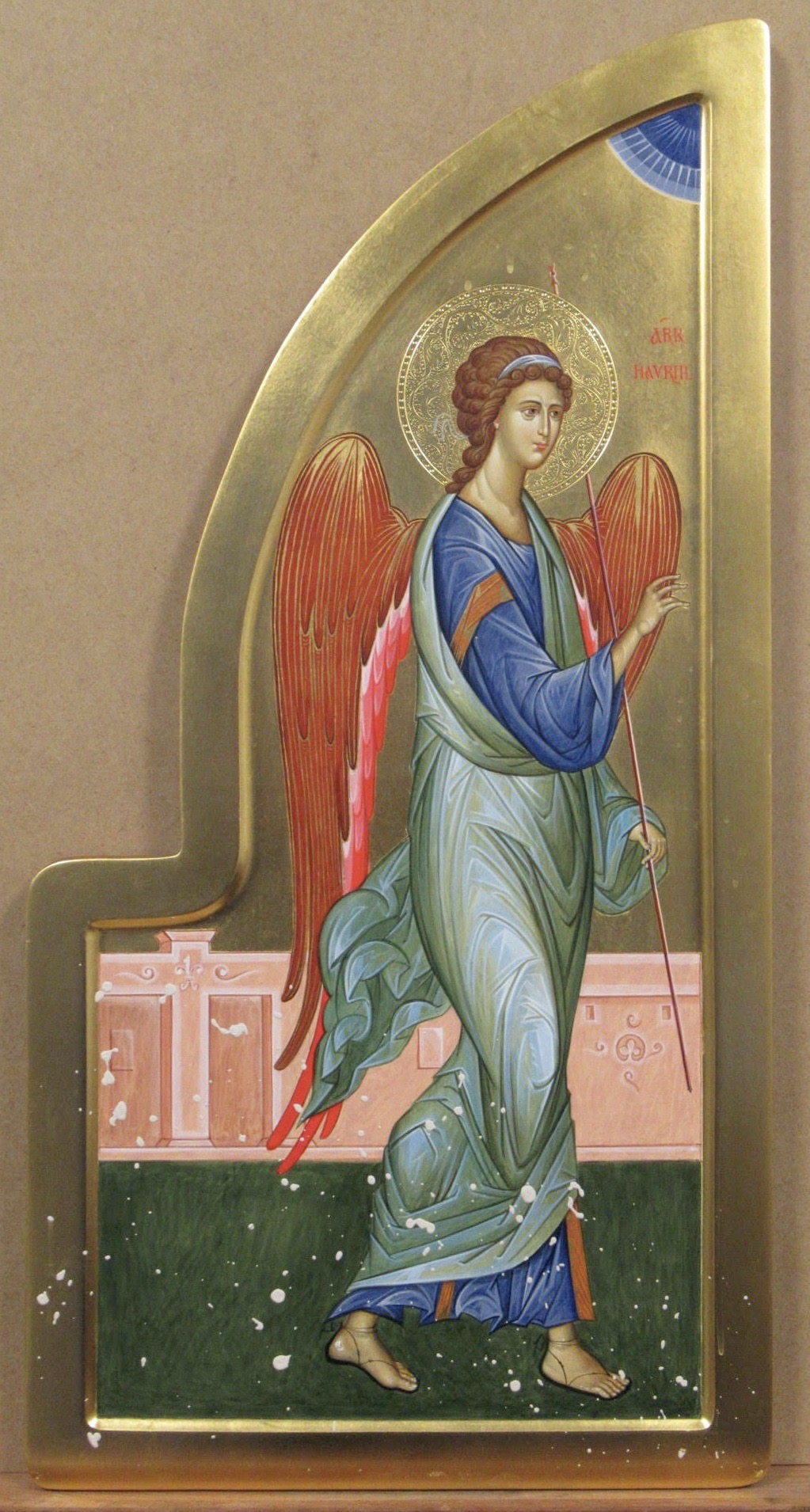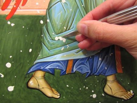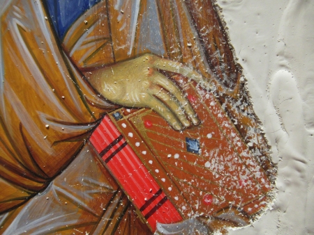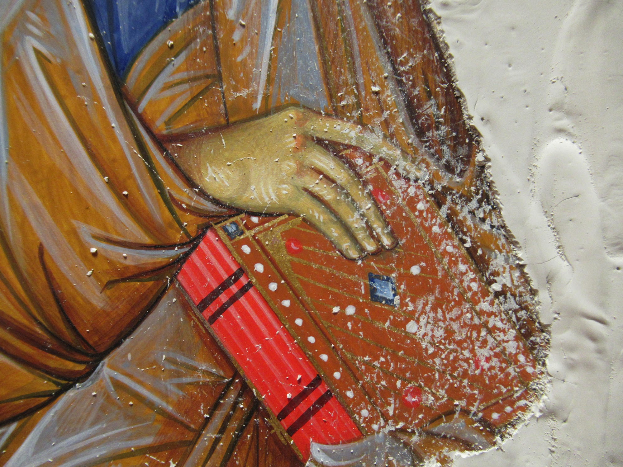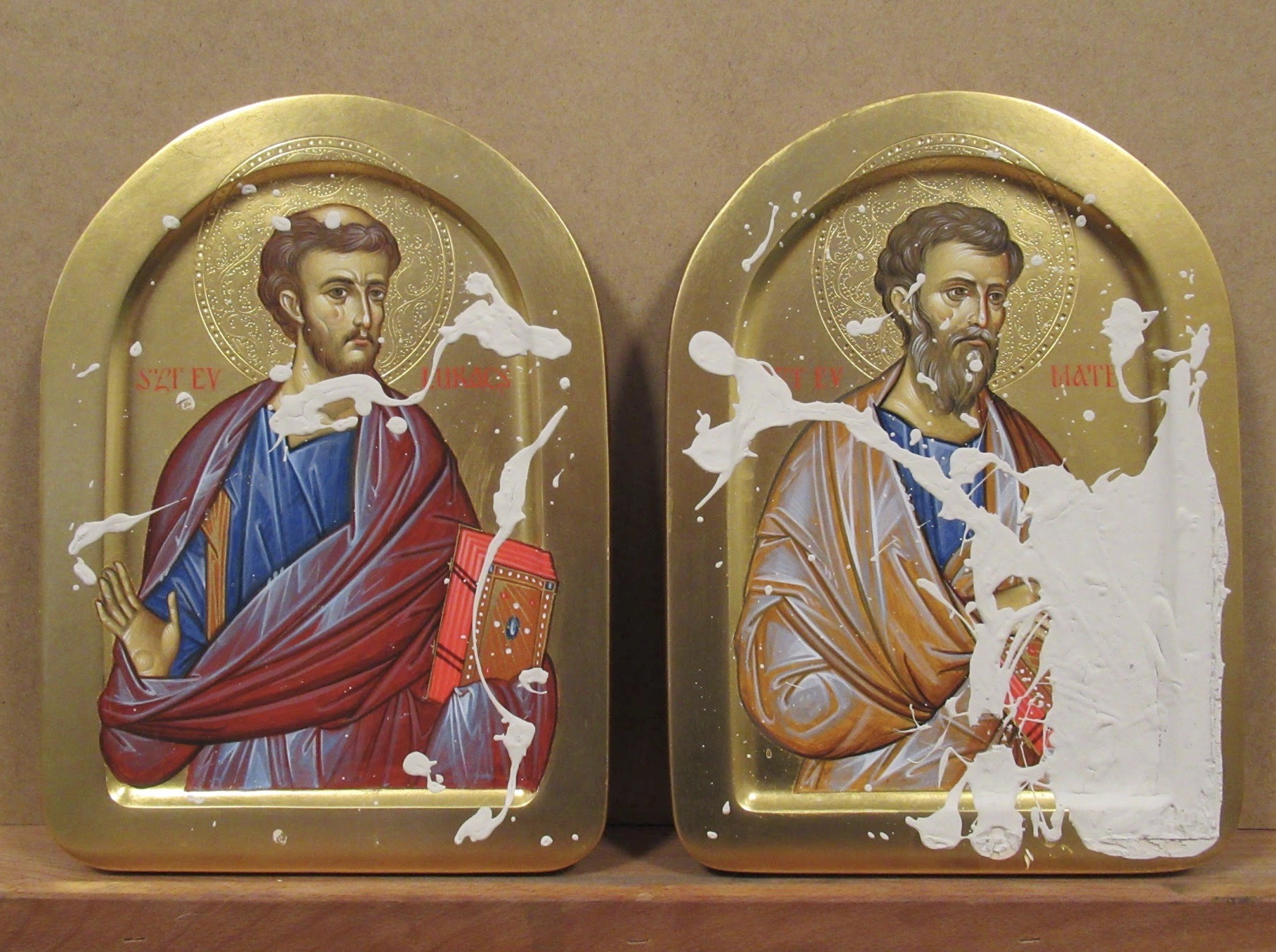 A sérült ikonok 2021. március 25-én, az angyali üdvözlet ünnepnapján kerültek műhelyembe. Az ikonokra rászáradt, rákeményedett festékfoltok eltávolítását mechanikusan, tompa orvosi szikével, majd nedves visszatörléssel végeztem. A finoman megfestett, érzékeny felületekről a legnagyobb óvatossággal 10 óra alatt tudtam eltávolítani a festéknyomokat.