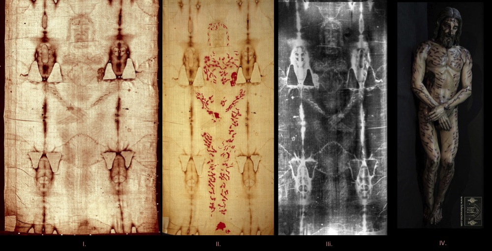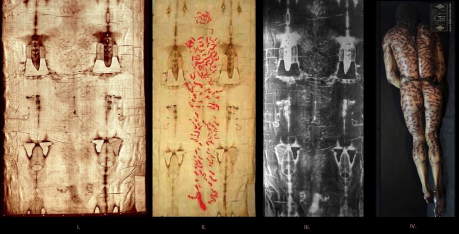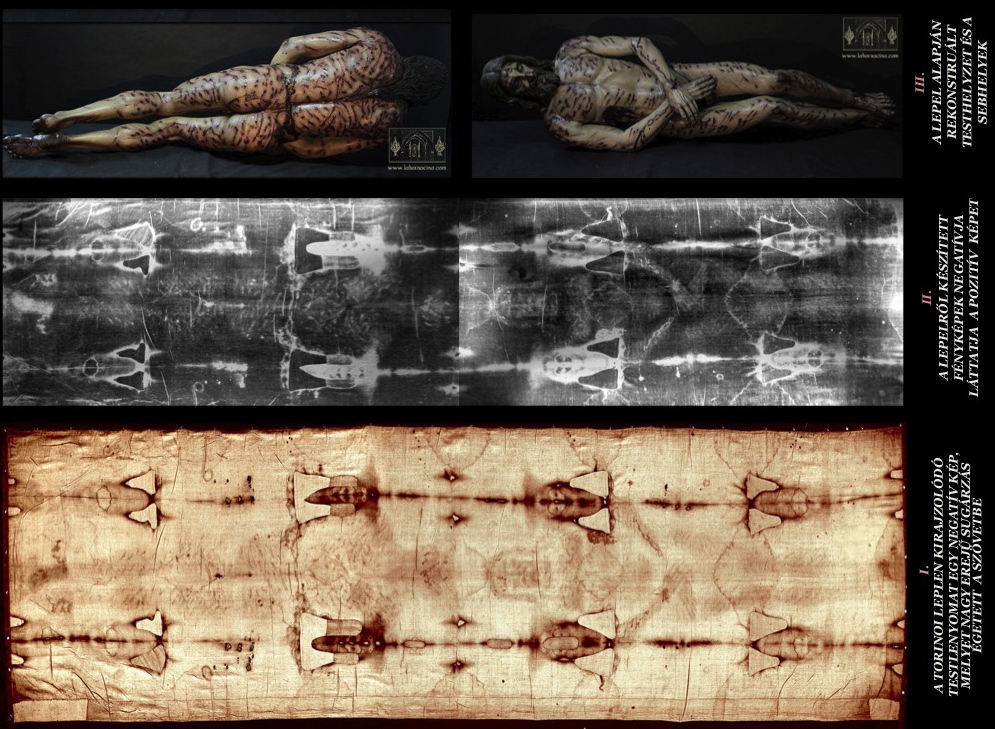 I. kép: A Torinoi leplen kirajzolódó testlenyomat egy negatív kép, melyet nagy erejű sugárzás égethetett a szövetbe. II. kép: A sebek rekonstrukciós rajza: A leplen felismerhetőek az ostorozás ütötte sebek, a töviskorona által okozott sebek, az átszegezett kéztő és lábfej vérfoltjai, valamint a lándzsával döfött oldalseb vérfoltja. III. kép: A Lepelről készített fényképek negatívja láttatja a pozitív képet. IV. kép: A Lepel alapján rekonstruált testhelyzet és a sebek elhelyezkedése