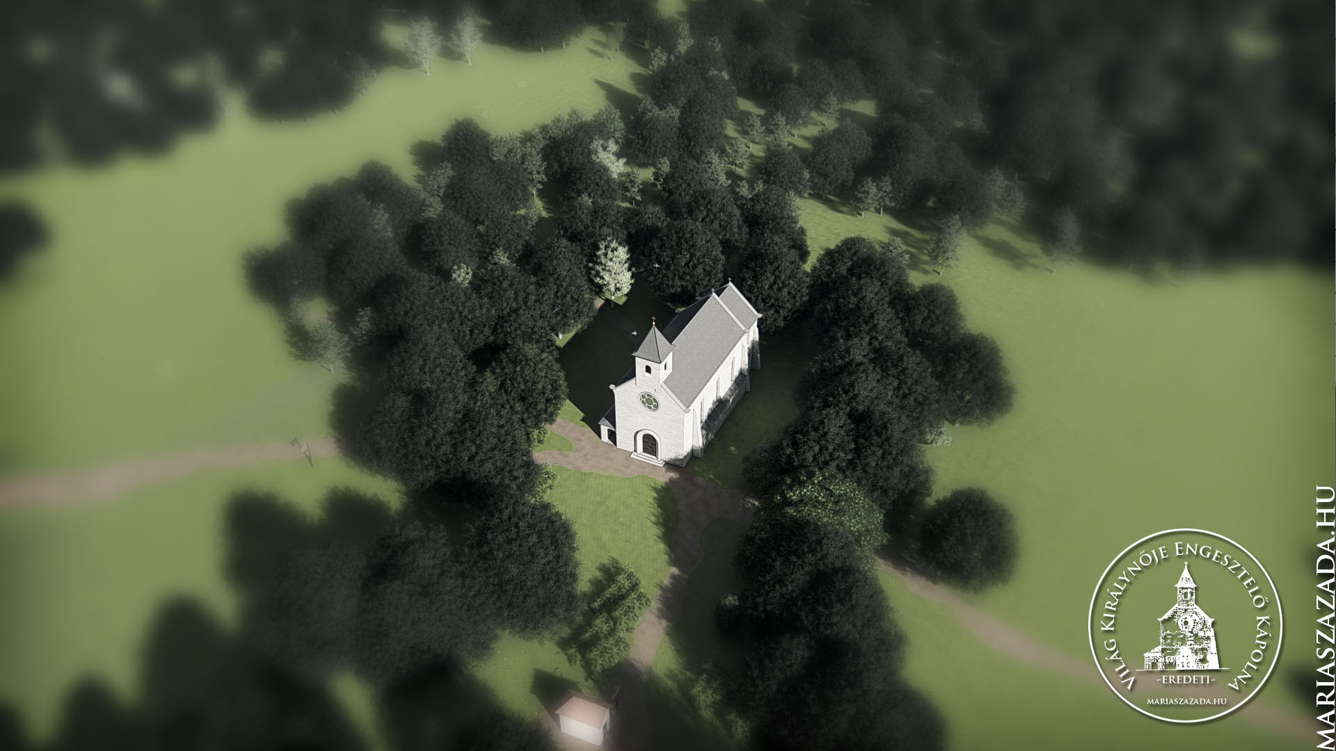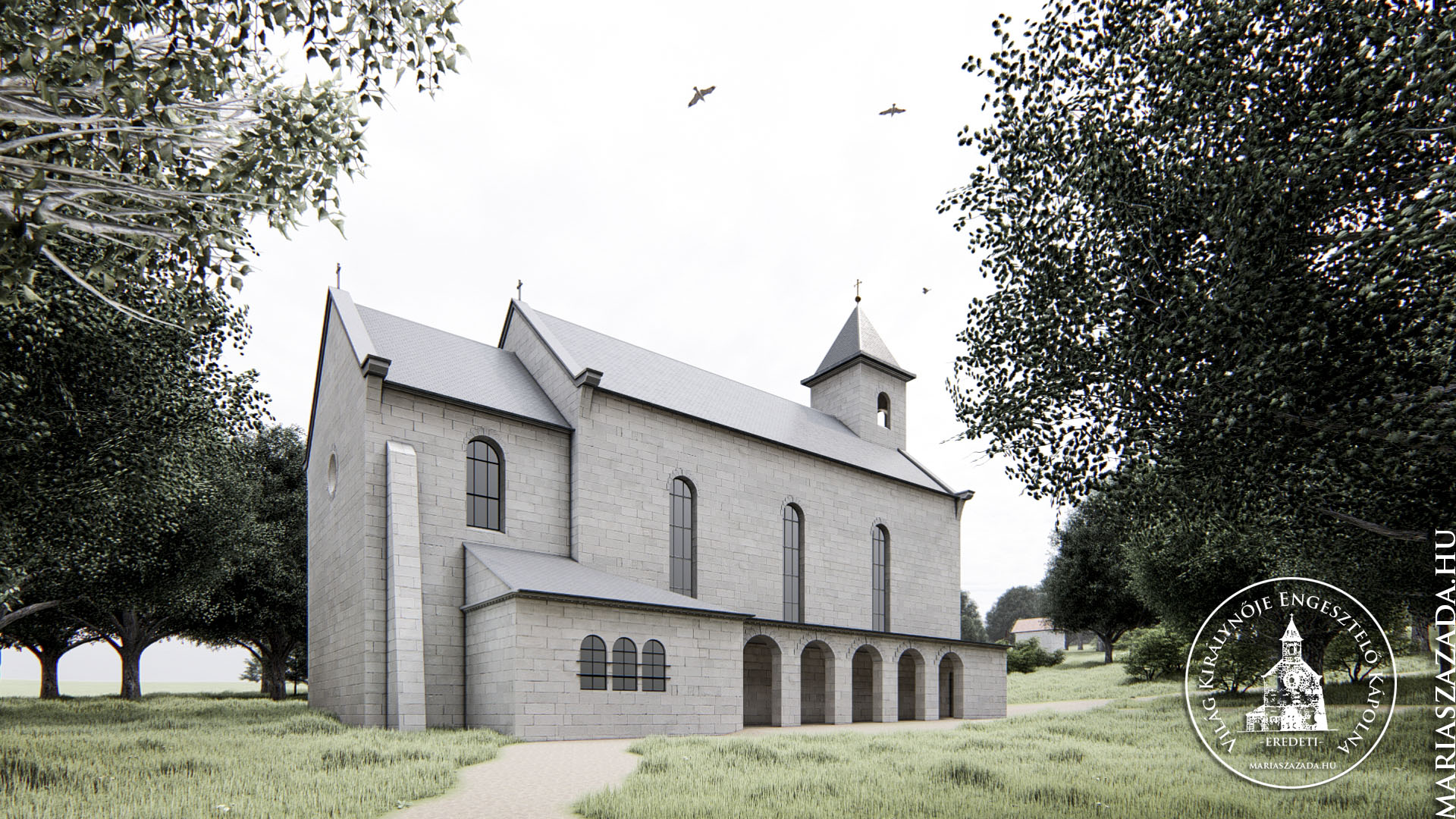 Keserű Balázs okl. építészmérnök 3D tanulmányterve Hermány Géza 1946-os terve alapján. (2023. február) Forrás: https://mariaszazada.hu/vilag-kiralynoje-engesztelo-kapolna-3d-02/