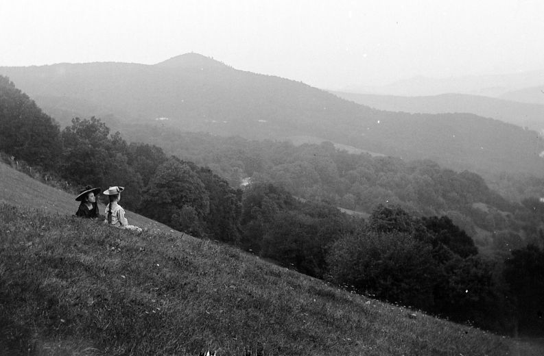 A SVÁBHEGY a kirándulók, pihenni vágyók kedvelt célpontja már a XVII. század óta  /  (1.) Két lány a Normafán 1900 körül (Forrás: fortepan.hu)  /  (2.) Kilátás a János-hegyre és a Hármashatár-hegyre (Saját fotó, 2022. szeptember 3.)