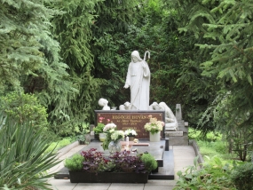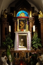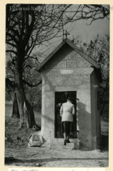 (1.) Regőczi István atya, az "Isten Vándora" / (2.) A tabernákulum és a kegykép (fotó: Thaler Tamás) / (3-4.) A kápolna szentélye és Regőczi István atya sírja a kápolna kertjében (Saját fotók 2022.)