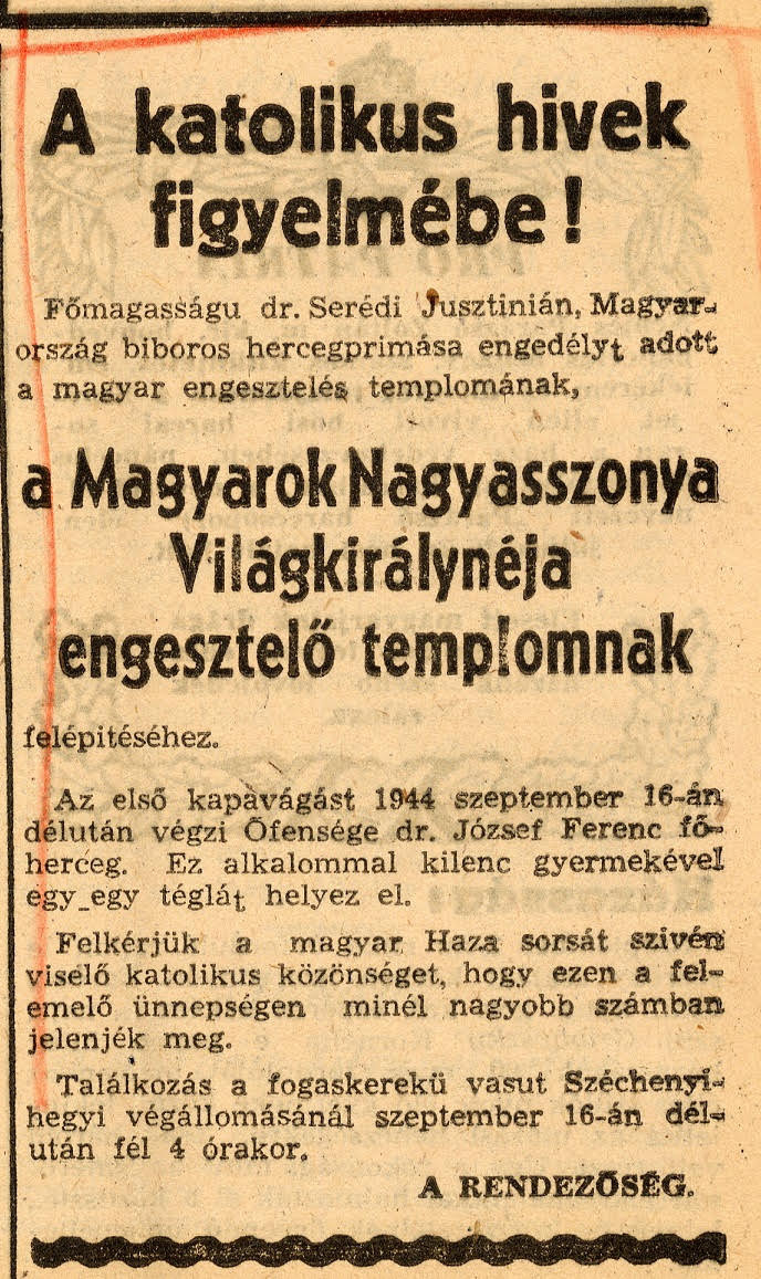 A kápolna engedélyeztetésének gondjairól a nagyközönség mit sem értesülhetett, így a hívek az alapkő elhelyezésére, a kápolna építésére készültek. A Nemzeti Újság 1944. szeptember 15-i (pénteki) száma felhívással fordult a katolikus hívekhez.