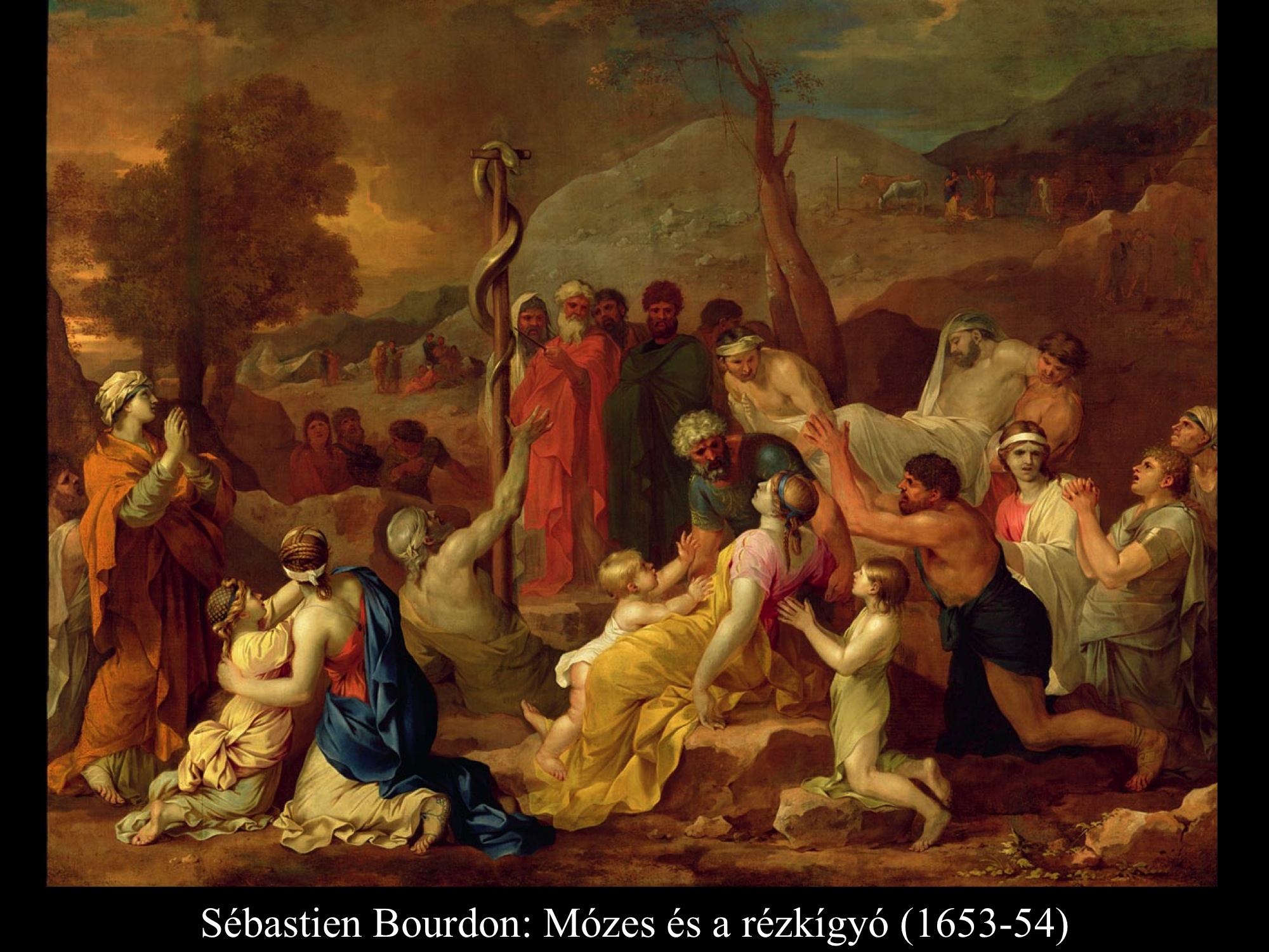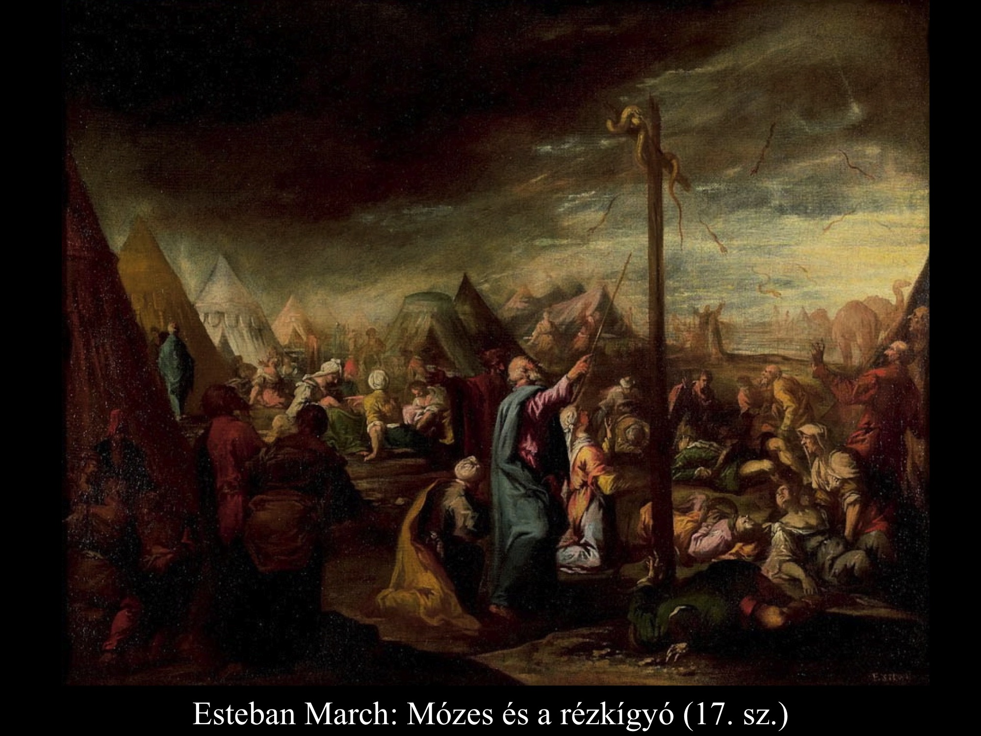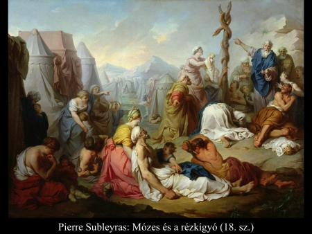 A nép azonban belefáradt a vándorlásba és zúgolódott az Úr és Mózes ellen: „Miért hoztatok ki Egyiptomból? Hogy elpusztuljunk a pusztában? Hisz se kenyér, se víz nincs! Ez a nyomorúságos eledel utálattal tölt el minket!” Erre az Úr tüzes kígyókat küldött a népre, ezek megmarták őket, úgyhogy Izrael fiai közül sokan meghaltak. Ennek láttára a nép Mózeshez járult, s megvallották: „Vétkeztünk, amikor zúgolódtunk az Úr ellen és te ellened. Járj közben értünk az Úrnál, hogy vigye el ezeket a kígyókat rólunk!” Mózes tehát közbenjárt a népért. S az Úr így válaszolt Mózesnek: „Csinálj egy tüzes kígyót, s erősítsd egy póznára. Akit marás ért és rátekint, életben marad!” Mózes tehát csinált egy rézkígyót és egy póznára tette. Akit megmartak a kígyók, de föltekintett a rézkígyóra, az életben maradt. (Szám 21,5-9)