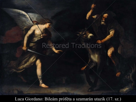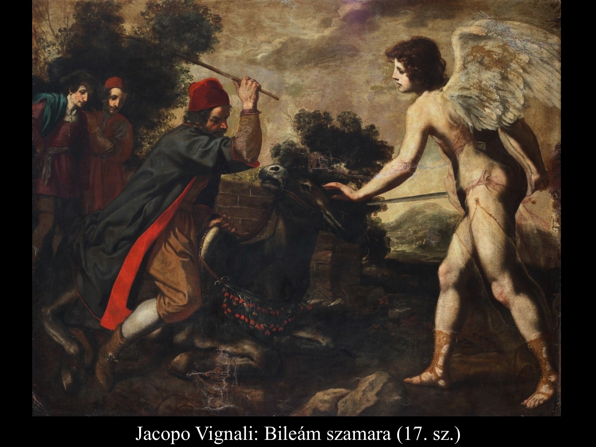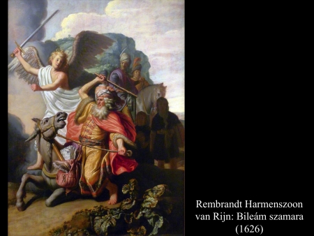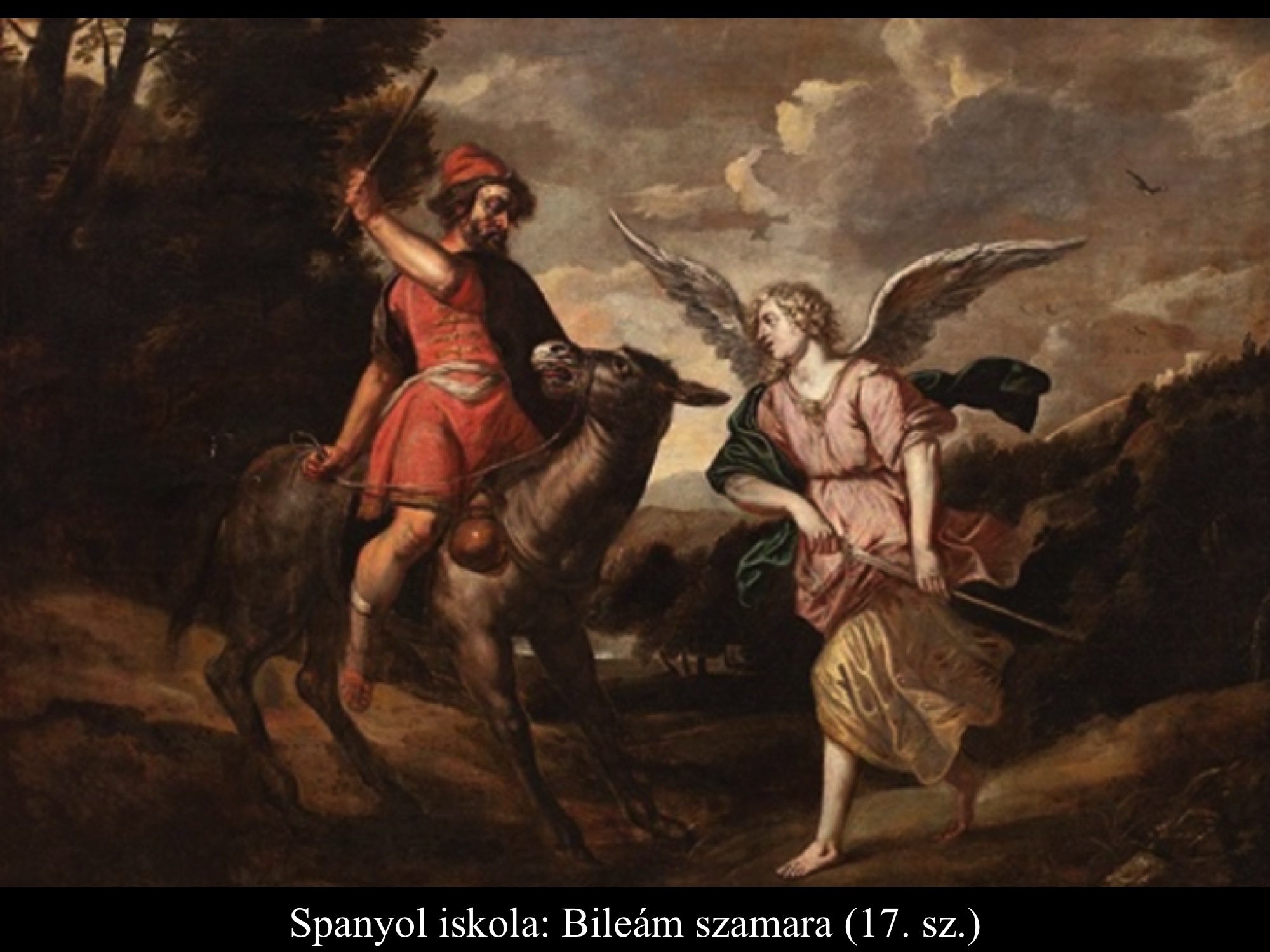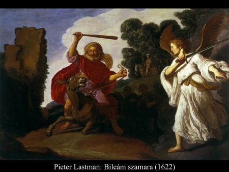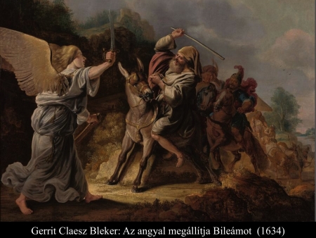 Az Úr most megnyitotta Bileám szemét, így meglátta az Úr angyalát, amint kivont kardot tartva kezében ott állt az úton. Erre meghajolt és arcra borult. Az Úr angyala azonban így szólt hozzá: „Miért verted meg háromszor is a szamarat? Lásd, én álltam utadat, mert sietésed ellenemre van. A szamár észrevett, s már háromszor kitért előlem. Ha nem tért volna ki, akkor bizony már megöltelek volna, de őt életben hagytam volna.” Bileám azt felelte az Úr angyalának: „Vétkeztem. Nem tudtam, hogy te voltál, aki az úton szemben álltál velem. Most már visszafordulok, ha nem tetszik neked a dolog.” De az Úr angyala ezt mondta: „Menj el az emberekkel! De csak azt szabad mondanod, amit sugallok neked.” Bileám erre folytatta útját Moáb vezéreivel. (Szám 22,22-35)