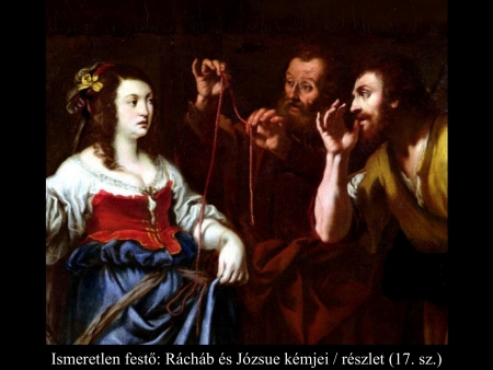 Mielőtt még nyugalomra tértek volna, Rácháb fölment hozzájuk a tetőre. Így beszélt: „Tudom, hogy az Úr nektek adta ezt a földet. Félelem fogott el bennünket tőletek, s az ország lakóit közeledéstekre mind hatalmába kerítette a rémület. Mert tudomásunkra jutott, hogy Egyiptomból való kivonulástok idején az Úr kiszárította előttetek a Sás-tengert, meg hogy mit tettetek az amoriták két királyával, Szichonnal és Oggal, a Jordánon túl: betöltöttétek rajtuk az átkot. Amikor meghallottuk, elhagyott a bátorságunk, és senki sem mert többé nektek ellenállni. Mert az Úr, a ti Istenetek, Isten fönn az égben éppen úgy, mint lenn a földön. Most hát esküdjetek meg nekem az Úrra, amint én könyörületes voltam irántatok, ti is megkönyörültök atyám házán, s adjatok erre valami megbízható jelet; hagyjátok életben apámat és anyámat, bátyáimat és nővéreimet és mindazokat, akik hozzájuk tartoznak, kíméljetek meg bennünket a haláltól.” A hírszerzők azt válaszolták: „Inkább magunk haljunk meg helyettetek! De ne áruljátok el egyezségünket! Ha az Úr nekünk adja az országot, könyörületesek és hűségesek leszünk hozzád.” Rácháb egy kötélen leengedte őket az ablakból, háza ugyanis a város falánál állt, a város fala mellett lakott. S így szólt hozzájuk: „Menjetek a hegyekbe, akkor kikerülitek azokat, akik üldözőbe vettek benneteket. Ott rejtőzzetek el három napig, üldözőitek visszatértéig, azután menjetek utatokra.” Az emberek azt felelték neki: „Az esküt, amit tétettél velünk, ezzel a föltétellel vagyunk kötelesek megtartani: Ha megérkezünk az országba, nézd, mutasd ezt a jelet: Kösd ezt a piros fonálból font zsinórt arra az ablakra, amelyen leengedtél bennünket, s gyűjtsd össze házadban apádat, anyádat, bátyáidat és egész családodat. Aki házad ajtaján kilép, annak hulljon a vére vissza a fejére, mi ártatlanok vagyunk benne. Hanem azoknak a vére, akik házadban lesznek, hulljon a mi fejünkre, ha valaki kezet emel rájuk. De ha elárulnál minket, nem köt az eskü, melyet neked tettünk.” Erre így válaszolt: „Úgy legyen, ahogy mondtátok.” Ezzel útra bocsátotta őket, s ők eltávoztak. Akkor az ablakra kötötte a piros zsinórt. (Józs 2,8-21)