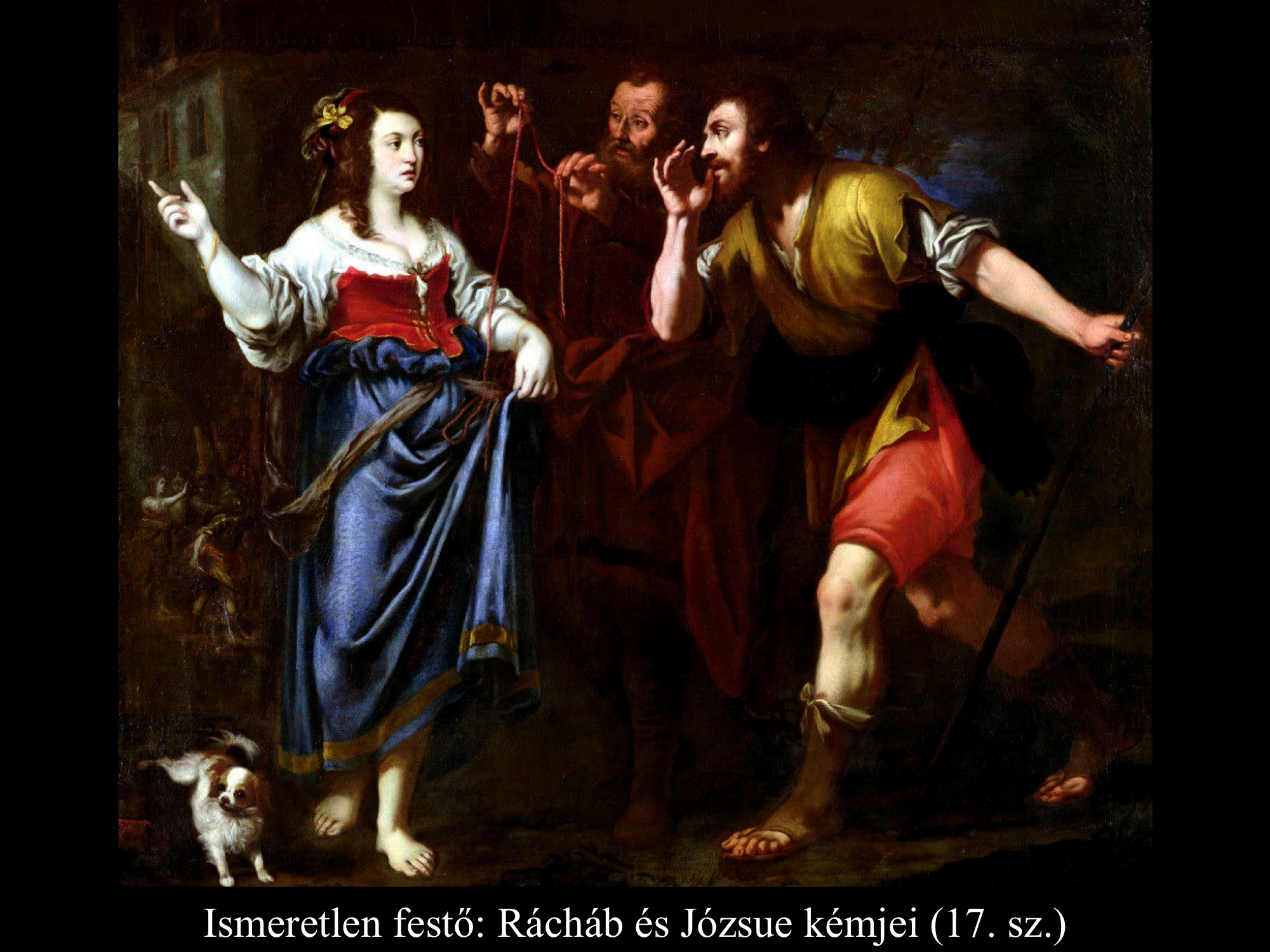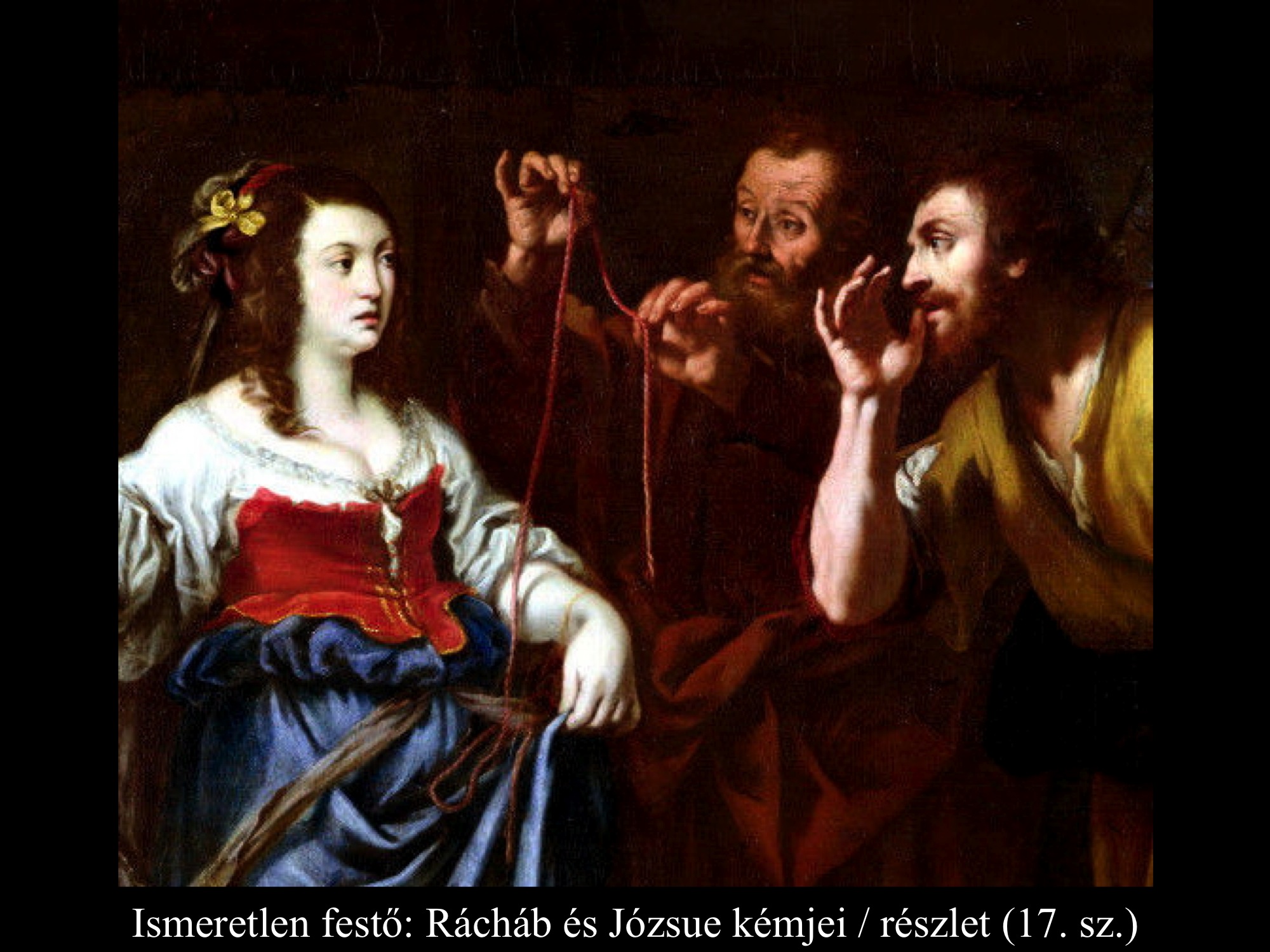 Józsue, Nun fia, Sittimből titokban két hírszerzőt küldött előre ezzel a megbízatással: „Menjetek, fürkésszétek ki Jerikó földjét!” Előre mentek, s egy Rácháb nevű rossz hírű nő házába tértek be, aztán nyugalomra tértek. Jerikó királyának nyomban jelentették: „Izrael fiai közül emberek érkeztek éjszakára, az országot kikémlelni.” Jerikó királya erre üzent Ráchábnak: „Add ki azokat az embereket, akik hozzád érkeztek s házadba betértek, mert azért jöttek, hogy az egész országot kikémleljék.” De az asszony fogta és elrejtette a két embert. Így válaszolt: „Valóban, ezek az emberek betértek hozzám, de nem tudtam, honnan valók. Amikor a sötétség beálltával be akarták zárni a város kapuit, kimentek. Nem tudom, hova mentek. De vegyétek gyorsan üldözőbe, s talán még utoléritek őket!” Közben fölvitte a tetőre, s ott a kupacokba rakott lenszár alá rejtette őket. A király emberei a Jordán irányában a gázlóig üldözték őket, a kaput pedig, mihelyt kivonultak, akik üldözőbe vették őket, bezárták. (Józs 2,1-7)