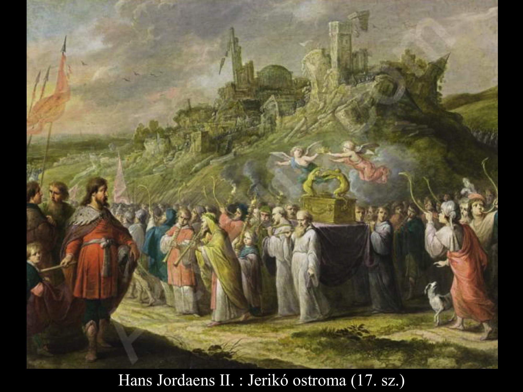 Jerikó gondosan bezárkózott [Izrael fiai előtt]: se ki nem jött senki, se be nem ment senki. Akkor az Úr így szólt Józsuéhoz: „Nézd, kezedbe adom Jerikót és királyát. Harcosaitok, a fegyverforgató férfiak mind kerüljék meg egyszer a várost, [s ugyanígy tégy te is hat napon át. Hét pap ugyanakkor vigyen hét harsonát a láda előtt. A hetedik nap hétszer menjetek körbe a város körül, a papok fújják meg a harsonákat]. Ha a kürt felharsan [ha halljátok a harsona hangját], az egész nép törjön ki egyetlen hatalmas csatakiáltásban. S a város falai menten leomlanak. Akkor hatoljon be a nép, ki-ki ott, ahol éppen van.” (Józs 6,1-5)