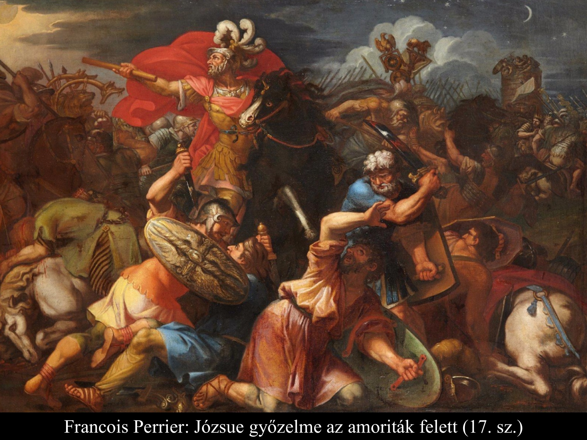 Az öt amorita király egyesült és felvonult: Jeruzsálem királya, Hebron királya, Jarmut királya, Lachis királya és Eglon királya, ők és csapataik ostrom alá vették Gibeont és megtámadták. Gibeon lakói követet küldtek Józsuéhoz Gilgalba, a táborba, ezzel az üzenettel: „Ne hagyd cserben szolgáidat, siess, gyere fel hozzánk, ments meg bennünket és segíts rajtunk, mert az összes amorita király, aki a hegyvidéken él, szövetkezett ellenünk.” Józsue maga ment fel, s vele minden harcosa és vitéze. Az Úr így szólt Józsuéhoz: „Ne félj! Kezedbe adom őket. Senki sem lesz képes ellenállni neked.” Józsue tehát hirtelen rajtuk ütött, miután az egész éjszakát azzal töltötték, hogy felvonuljanak Gilgalból. Az Úr zavart támasztott köztük Izrael láttára, és súlyos csapást mért rájuk Gibeonnál. Sőt, Bet-Horon lejtőjének az irányában, egészen Azekáig és Makkedáig üldözte őket. Bet-Horon lejtőjén menekültek Izrael elől. Az Úr hatalmas jégesőt bocsátott rájuk az égből, egészen Azekáig; így odavesztek. Többen pusztultak el közülük a jégesőtől, mint Izrael fiainak kardja élétől. Akkor így szólt Józsue az Úrhoz, azon a napon, amelyen az Úr kiszolgáltatta neki az amoritákat –, Izrael szeme láttára fölkiáltott: „Nap, állj meg Gibeon fölött, s Hold, Ajalon völgye fölött!” S a Nap megállt, a Hold is megállt, amíg a nép bosszút nem állt ellenségein. De nincs-e megírva az Igazak könyvében? A Nap megállt az ég közepén, s csaknem egy egész napig halogatta lenyugtát. Se azelőtt, se azután nem volt még egy olyan nap, amelyen az Úr hallgatott volna embernek a szavára. Így harcolt az Úr Izraelért. Józsue és vele együtt egész Izrael visszatért a táborba, Gilgalba. (Józs 10,5-15)