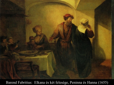 Volt egy Ramatajimba való ember, egy cufita, Efraim hegyéről. Elkanának hívták, s Jerochám fia volt, Elihu fiáé, (aki) az efratita Cuf fiának, Tochunak volt a fia. Két felesége volt, az egyiket Hannának hívták, a másikat Peninnának. Peninnának voltak gyermekei, Hannának azonban nem volt gyermeke. Ez az ember minden esztendőben fölment, hogy Silóban imádja a Seregek Urát, és áldozatot mutasson be neki. [Éli két fia, Hofni és Pinchász voltak ott az Úr papjai.] Az egyik nap Elkana áldozatot mutatott be. Az volt a szokása, hogy a feleségének, Peninnának, valamint a fiainak és lányainak több darabot ad, Hannának azonban, bár jobban szerette, csak egy darabot adott, mert az Úr meddővé tette. Vetélytársa is folyvást sértegette, el akarta keseríteni amiatt, hogy az Úr meddővé tette a méhét. Így ment ez évről évre. Minden alkalommal, amikor csak fölmentek az Úr templomához, sértegette. Ezért Hanna sírt és nem evett semmit. Akkor férje, Elkana, így szólt hozzá: „Hanna, miért sírsz, és miért nem eszel? Miért vagy boldogtalan? Hát nem több vagyok én neked, mint tíz fiú? (1 Sám 1,1-8) - Barend Fabritius (1655) festményén ezzel a kérdéssel fordul Hanna felé Elkana.