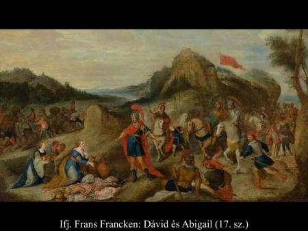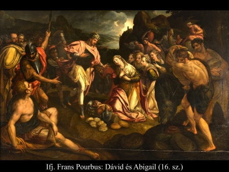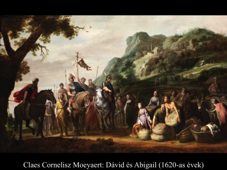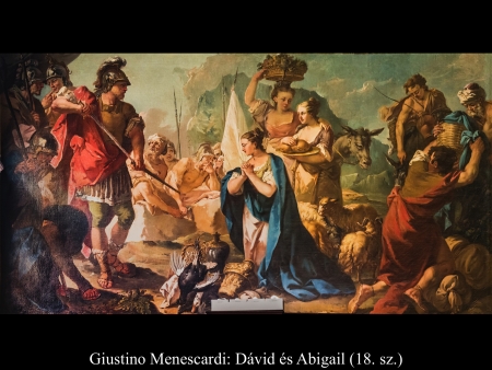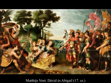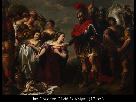 Amikor Abigail hazatért Nabalhoz, az épp lakomát tartott, akkorát, mint egy király. Nabal jókedvű volt és teljesen részeg. Ezért hajnalig nem beszélt el neki semmit. Reggel azonban, amikor Nabal kijózanodott, elmondta neki a felesége, mi történt. Erre a szíve megdermedt testében és olyan lett, mintha megkövült volna. Tíz nappal később az Úr lesújtott Nabalra, úgyhogy meghalt. Amikor Dávid megtudta, hogy Nabal meghalt, így szólt: „Áldom az Urat, aki bosszút állt Nabalon, amiért lekicsinyelt. Szolgáját megóvta az igazságtalanságtól, de Nabal gonoszságát hagyta, hadd szálljon vissza a fejére.” Ezután Dávid elküldött és megkérte Abigailt, hogy legyen a felesége. Dávid emberei elmentek, és Kármelben találták Abigailt. Így szóltak hozzá: „Dávid küldött bennünket, vigyünk el neki feleségül.” Erre fölállt, egész a földig hajolt, és azt mondta: „Szolgálód készen van rá, hogy mint egy rabszolganő, megmossa uram szolgáinak a lábát.” Aztán Abigail gyorsan fölegyenesedett és felszállt a szamarára. Öt szolgálólány kísérte. Így követte Dávid embereit, s a felesége lett. Dávid azonban a jiszreeli Achinoamot is elvette. Így mind a ketten a feleségei lettek. Saul meg a Gallimból való Lajis fiának, Paltinak adta oda a lányát, Michalt, Dávidnak a feleségét feleségül. (1 Sám 25,1-44)