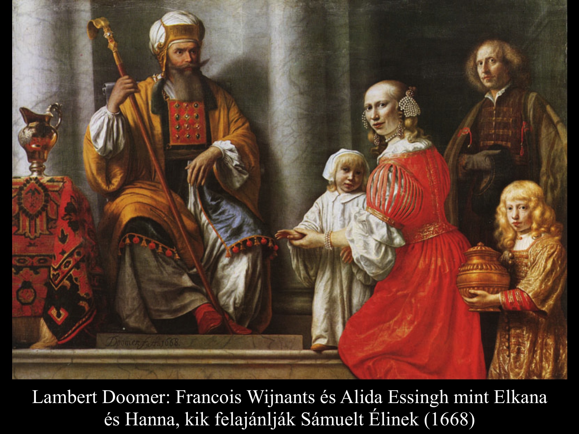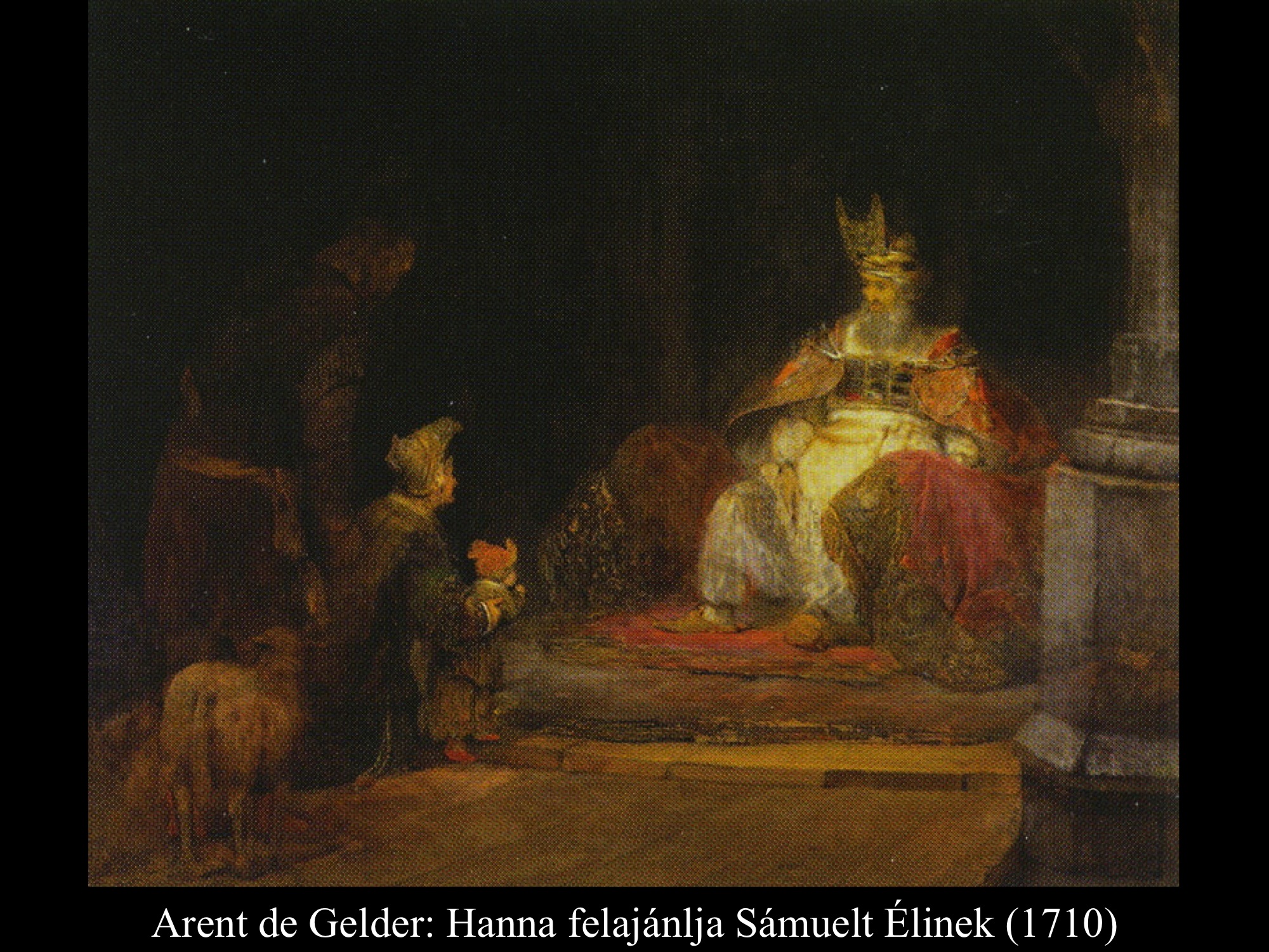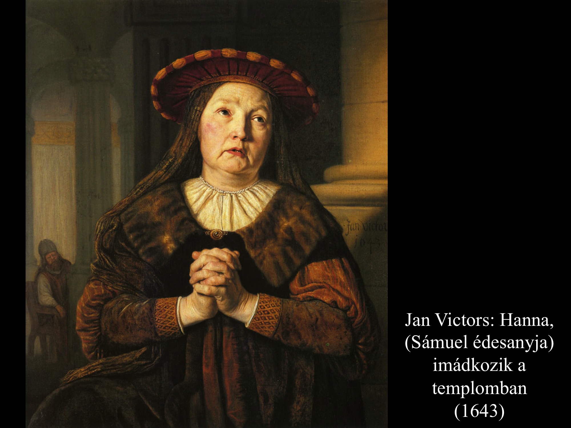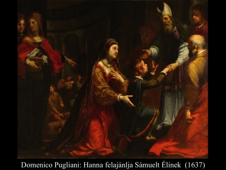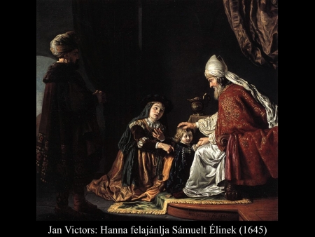 ”Hanna azonban, amikor a lakoma véget ért a teremben, fölállt és az Úr elé járult. Éli, a pap, egy széken ült az Úr szentélyének egyik kapufélfájánál. (Hanna) elkeseredettségében az Úrhoz könyörgött, és nagyon sírt. Fogadalmat tett, és így szólt: „Seregek Ura, ha tekintetbe veszed szolgálód nyomorúságát és megemlékezel rólam, ha nem feledkezel meg szolgálódról, hanem megajándékozol egy fiúval, akkor az Úrnak szentelem, olló ne érje fejét.” Így imádkozott az Úr előtt. Éli közben figyelte a száját. Hanna ugyanis csöndben imádkozott, csak ajkai mozogtak, hangja nem hallatszott. Emiatt Éli részegnek vélte, ezért így szólt hozzá Éli: „Meddig akarsz még itt maradni ilyen részegen? Igyekezz kijózanodni!” De Hanna ezt válaszolta: „Nem, uram! Szerencsétlen asszony vagyok, sem bort, sem mámorító italt nem ittam, csak a szívemet öntöttem ki az Úr előtt. Ne tartsd szolgálódat semmirekellőnek! Mert nagy bánatomban és szomorúságomban imádkoztam ilyen sokáig.” Éli így felelt rá: „Menj békével! Izrael Istene teljesíti kérésedet, amelyet elé terjesztettél.” Erre azt mondta: „Bárcsak tetszésre találna szolgálód szemedben.” Aztán az asszony elment útjára, evett, és az arca nem volt többé olyan, mint azelőtt. (1 Sám 1,9-18) Jan Victors (1643) festménye azt a pillanatot tárja elénk, mikor a háttérből figyelő Éli főpap megszólítja a templomban imádkozó Hannát.