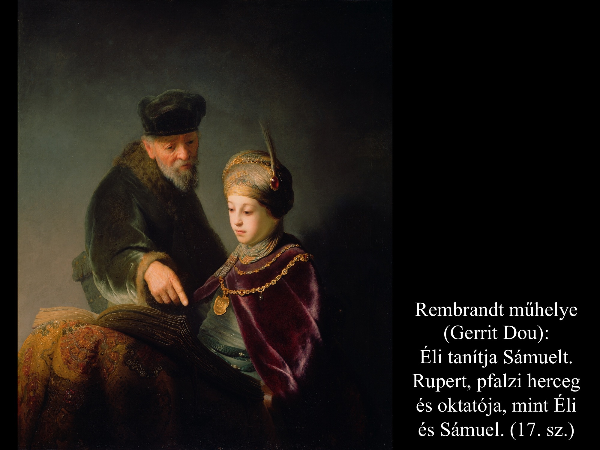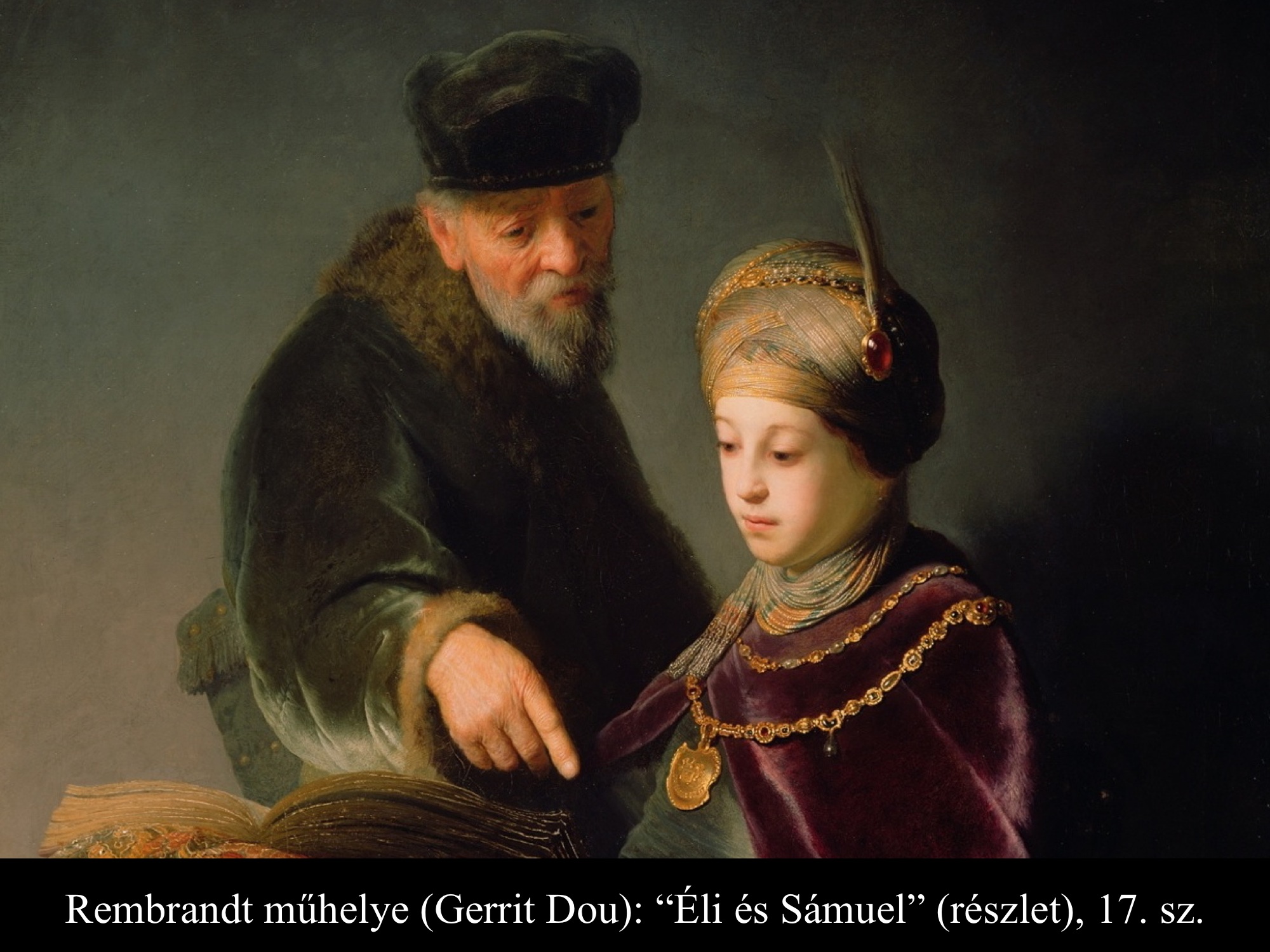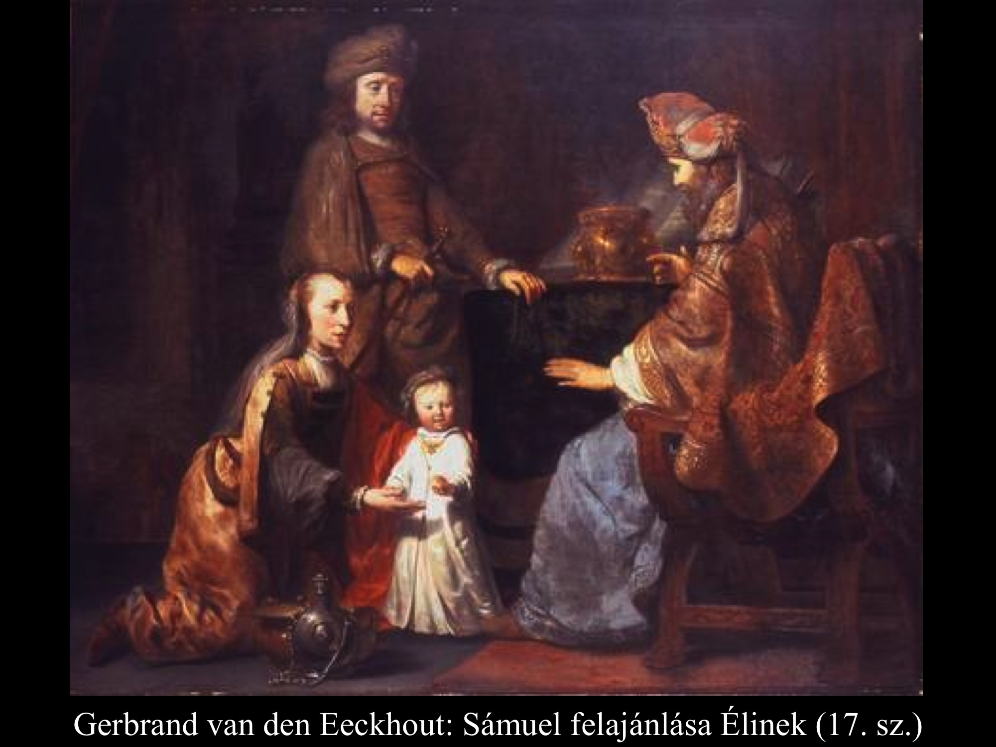 ”Hanna azonban, amikor a lakoma véget ért a teremben, fölállt és az Úr elé járult. Éli, a pap, egy széken ült az Úr szentélyének egyik kapufélfájánál. (Hanna) elkeseredettségében az Úrhoz könyörgött, és nagyon sírt. Fogadalmat tett, és így szólt: „Seregek Ura, ha tekintetbe veszed szolgálód nyomorúságát és megemlékezel rólam, ha nem feledkezel meg szolgálódról, hanem megajándékozol egy fiúval, akkor az Úrnak szentelem, olló ne érje fejét.” Így imádkozott az Úr előtt. Éli közben figyelte a száját. Hanna ugyanis csöndben imádkozott, csak ajkai mozogtak, hangja nem hallatszott. Emiatt Éli részegnek vélte, ezért így szólt hozzá Éli: „Meddig akarsz még itt maradni ilyen részegen? Igyekezz kijózanodni!” De Hanna ezt válaszolta: „Nem, uram! Szerencsétlen asszony vagyok, sem bort, sem mámorító italt nem ittam, csak a szívemet öntöttem ki az Úr előtt. Ne tartsd szolgálódat semmirekellőnek! Mert nagy bánatomban és szomorúságomban imádkoztam ilyen sokáig.” Éli így felelt rá: „Menj békével! Izrael Istene teljesíti kérésedet, amelyet elé terjesztettél.” Erre azt mondta: „Bárcsak tetszésre találna szolgálód szemedben.” Aztán az asszony elment útjára, evett, és az arca nem volt többé olyan, mint azelőtt. (1 Sám 1,9-18) Jan Victors (1643) festménye azt a pillanatot tárja elénk, mikor a háttérből figyelő Éli főpap megszólítja a templomban imádkozó Hannát.