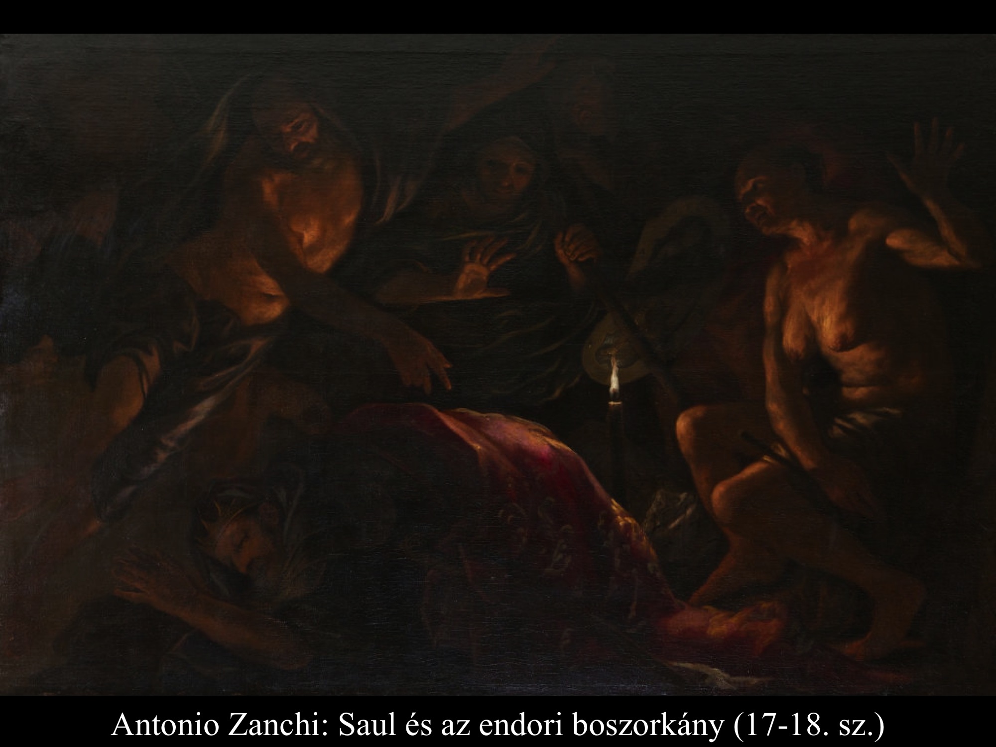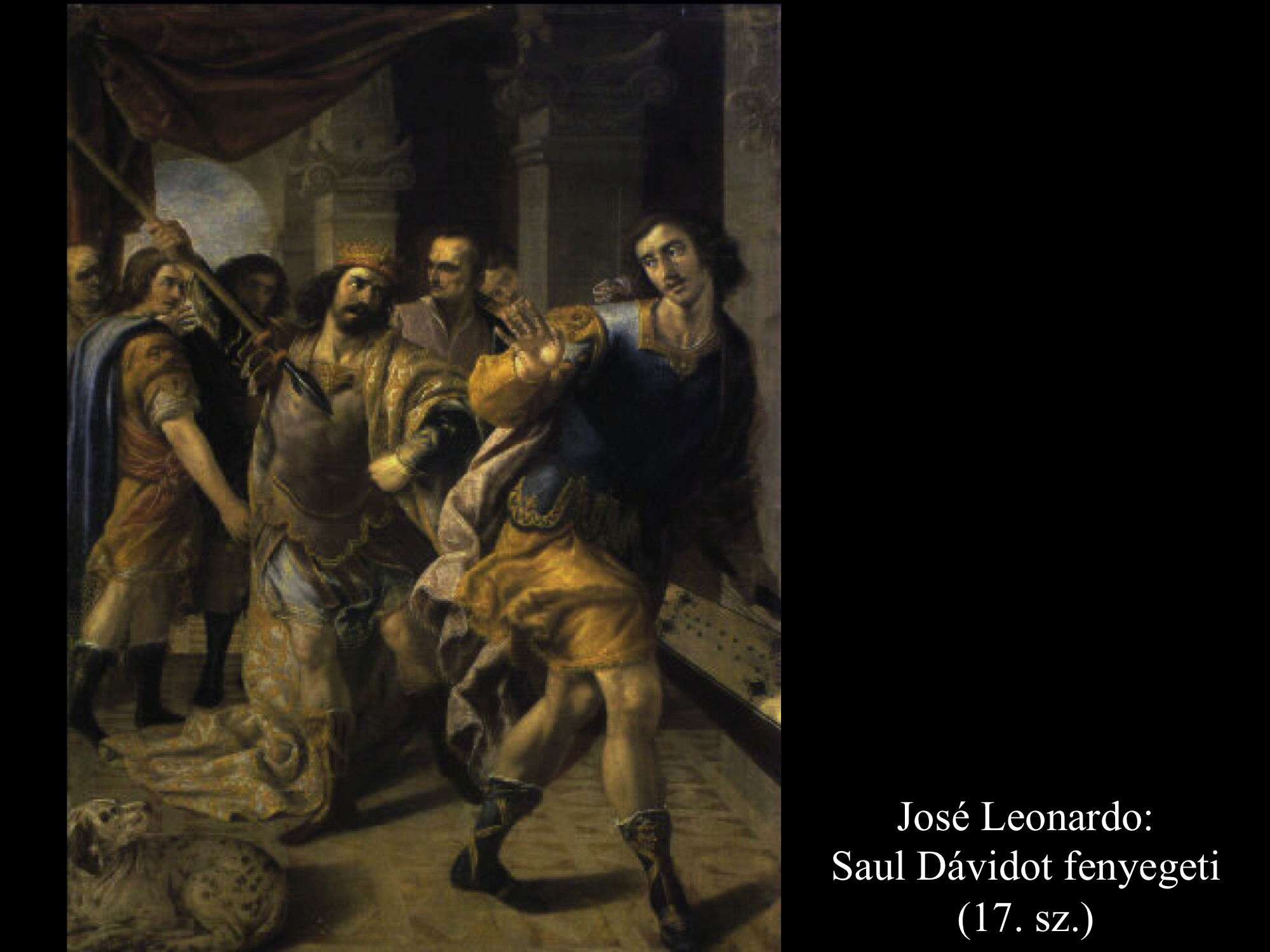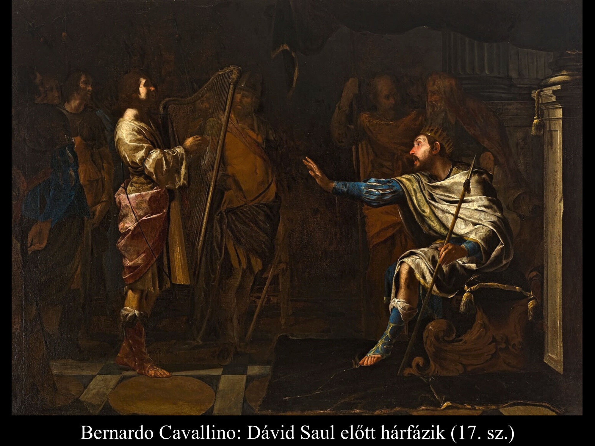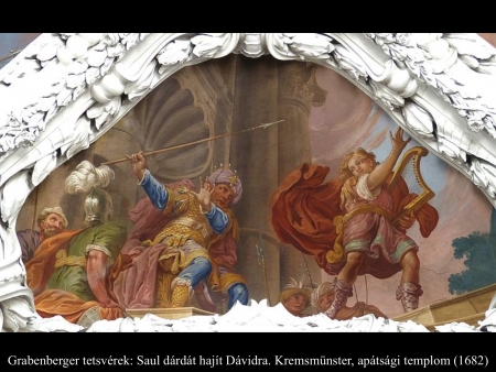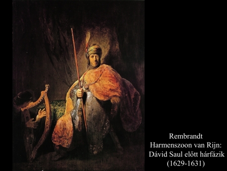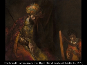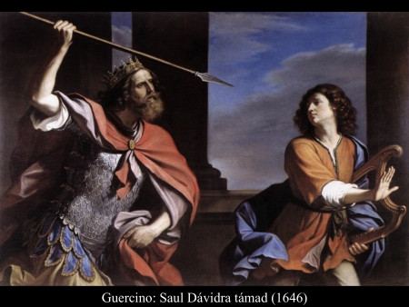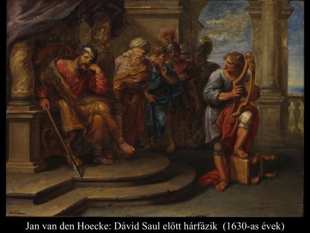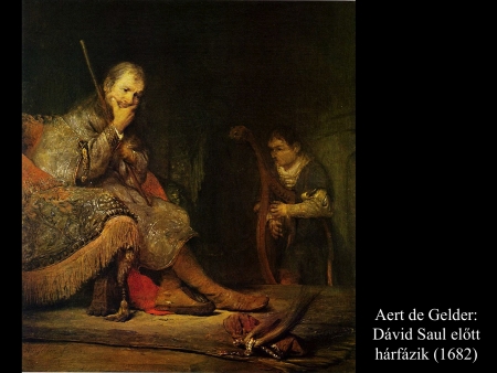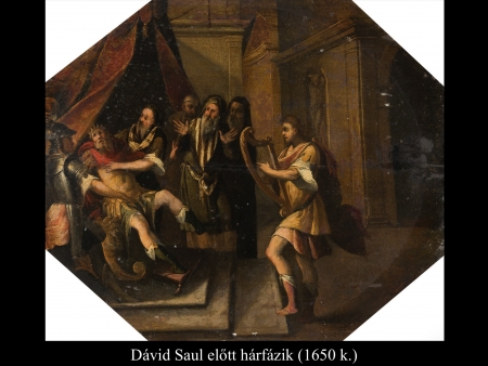 Az ismeretlen festő képén (1650 k.) a gonoszlélektől zaklatott Saul királyt szinte úgy kell lefogni, mikor Dávid színe elé lép hárfájával.
